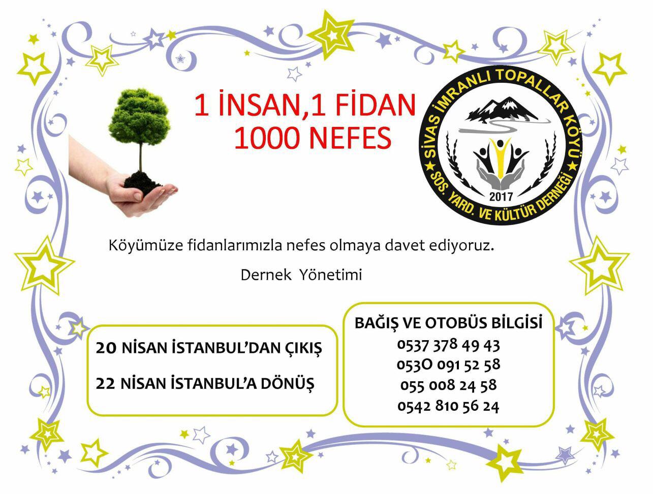 Sivas İmranlı Topallar Köyü Sosyal Yardımlaşma ve Kültür Derneği, “1 İnsan, 1 fidan 1000 nefes” şiarıyla Topallar Köyü’ne fidan dikimi başlatıyor. Sosyal medyada paylaştıkları bir afişle etkinliğin duyurusunu yapan dernek yönetimi, “Köyümüze fidanlarımızla nefes olmaya davet ediyoruz” dedi.