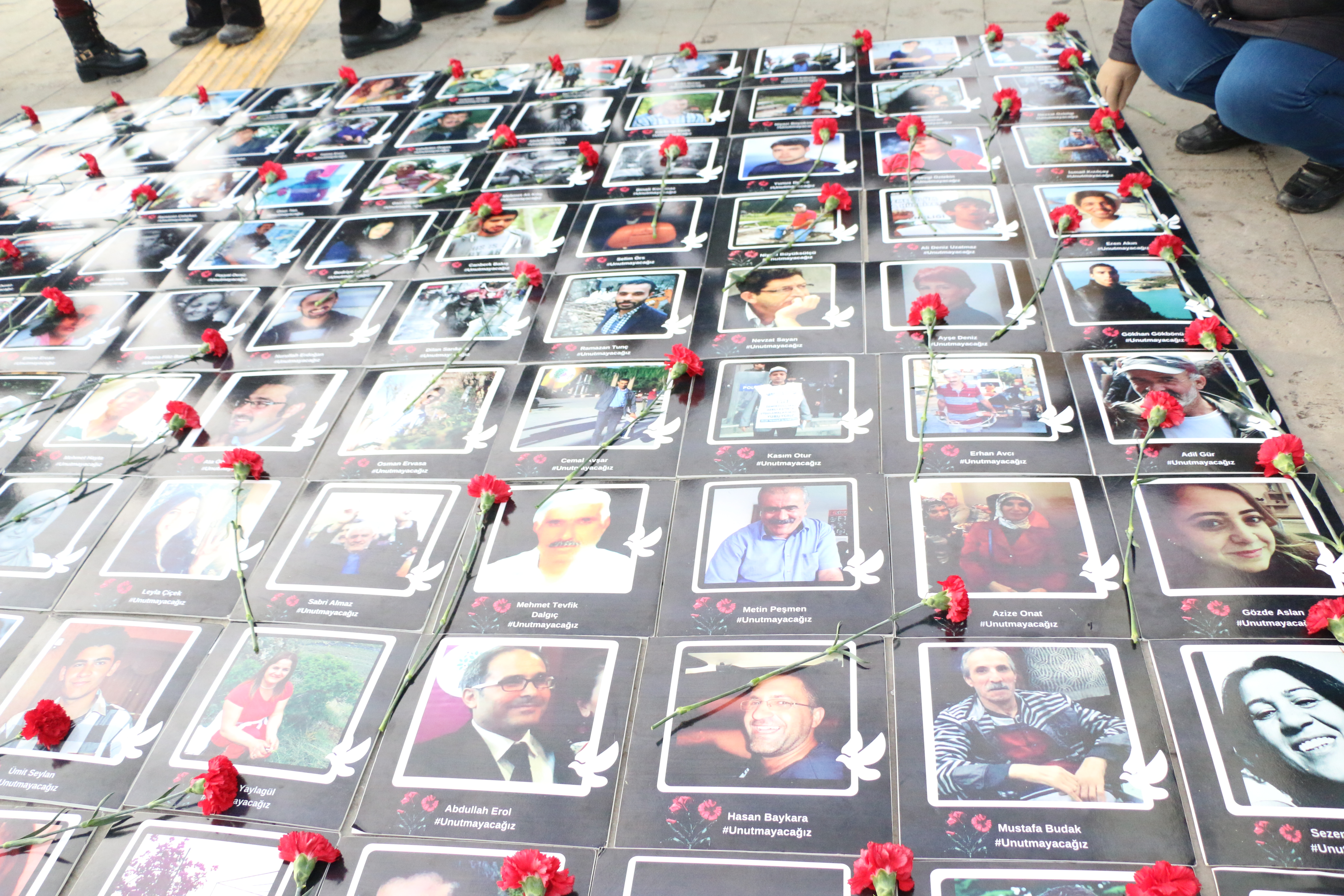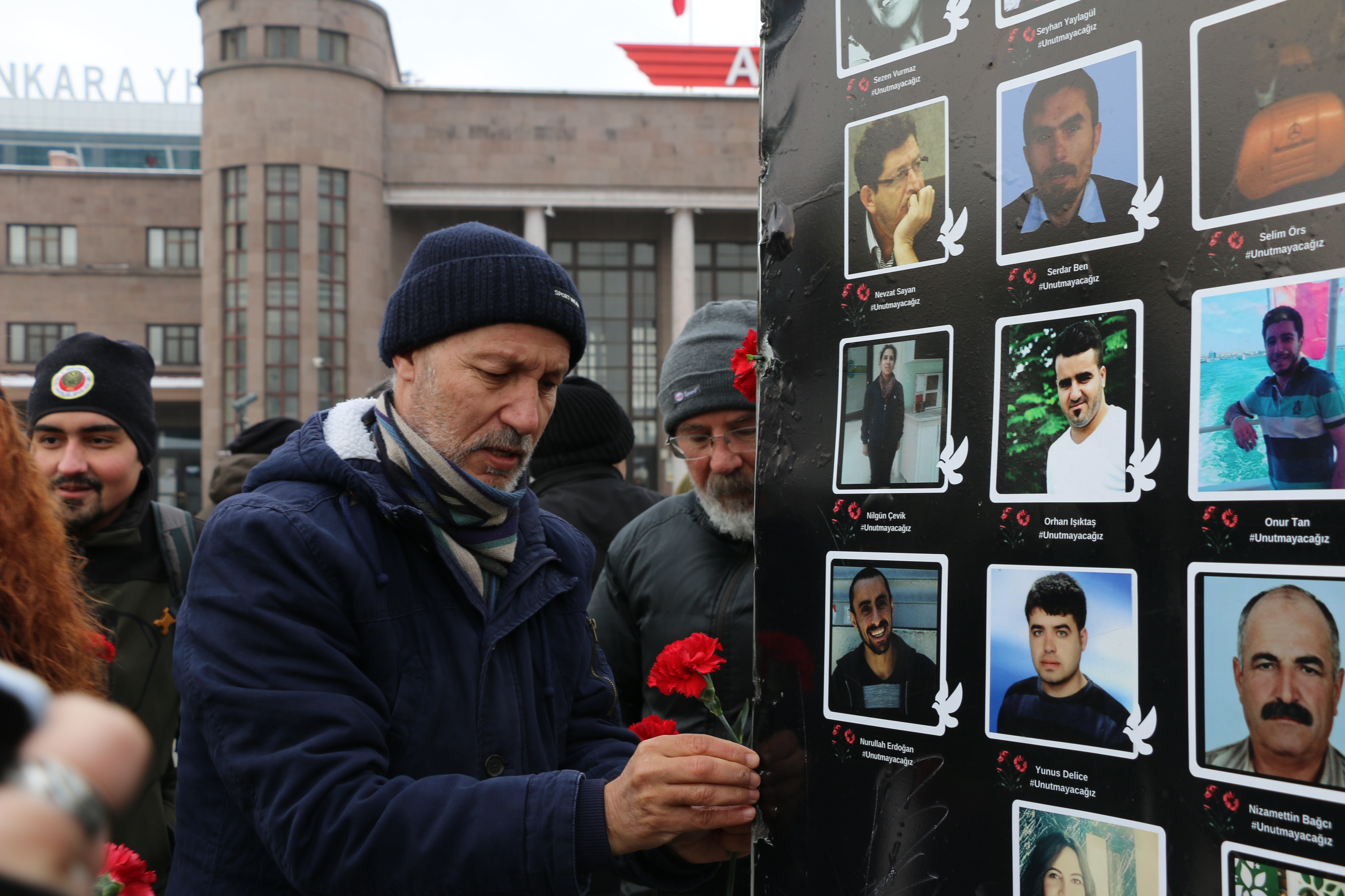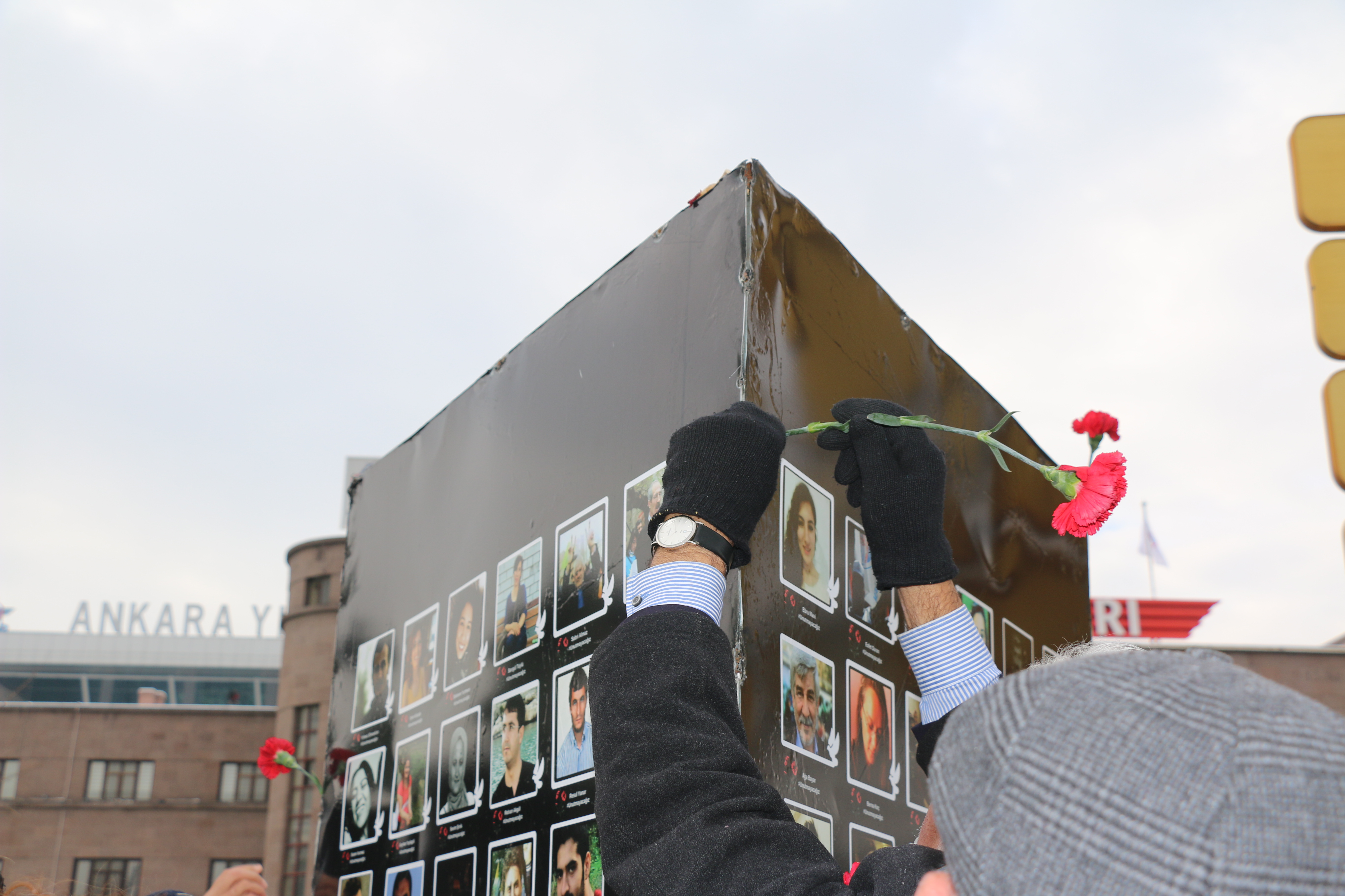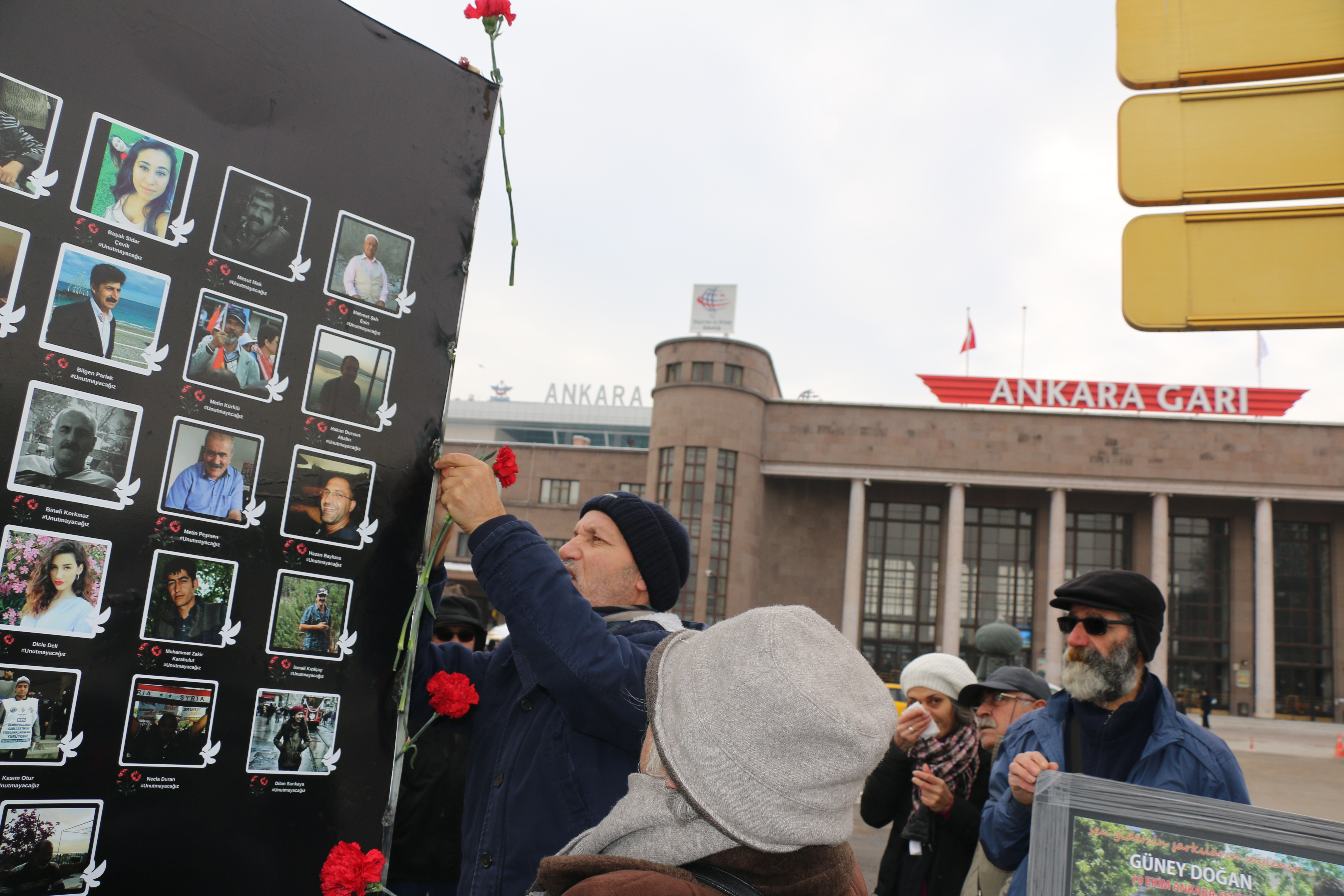 10 Ekim Ankara Katliamı’nda yaşamını yitirenler saldırının 39. ayında da unutulmadı. 103 kişinin hayatını kaybettiği ve yüzlerce kişinin yaralandığı katliamın gerçekleştiği Ankara Garı önünde bir araya gelen aileler, sendikalar ve siyasi partiler buraya karanfiller bıraktı.