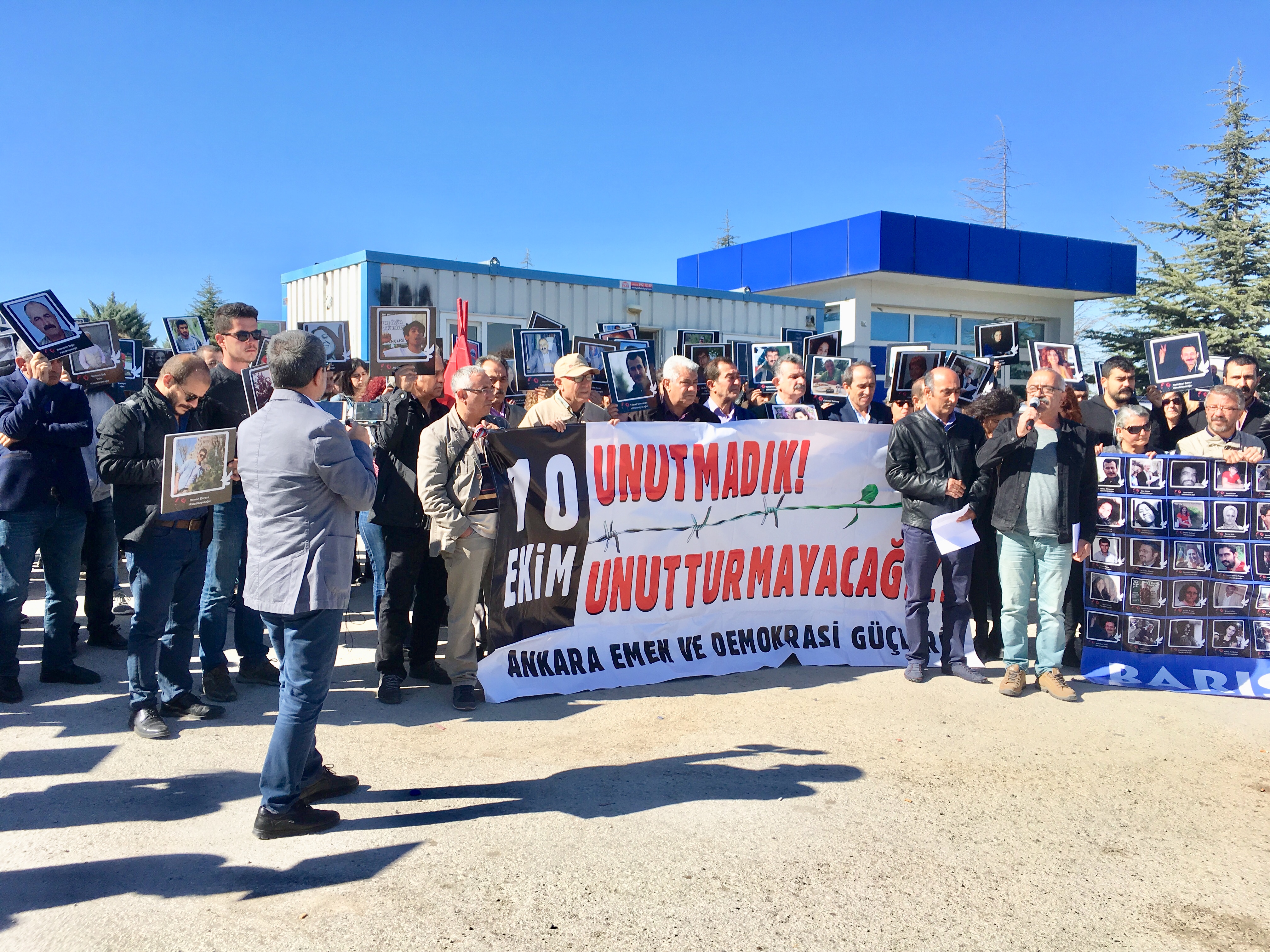 Ankara’da Karşıyaka mezarlığında 5 No’u kapıda bir araya gelen KESK, TMMOM, DİSK VE TTB ve 10 Ekim Derneği üyesi ile siyasi partiler temsilcisinin katılım gösterdiği anmada mezarlık ziyaretlerinden önce bir basın açıklaması gerçekleştirildi.
