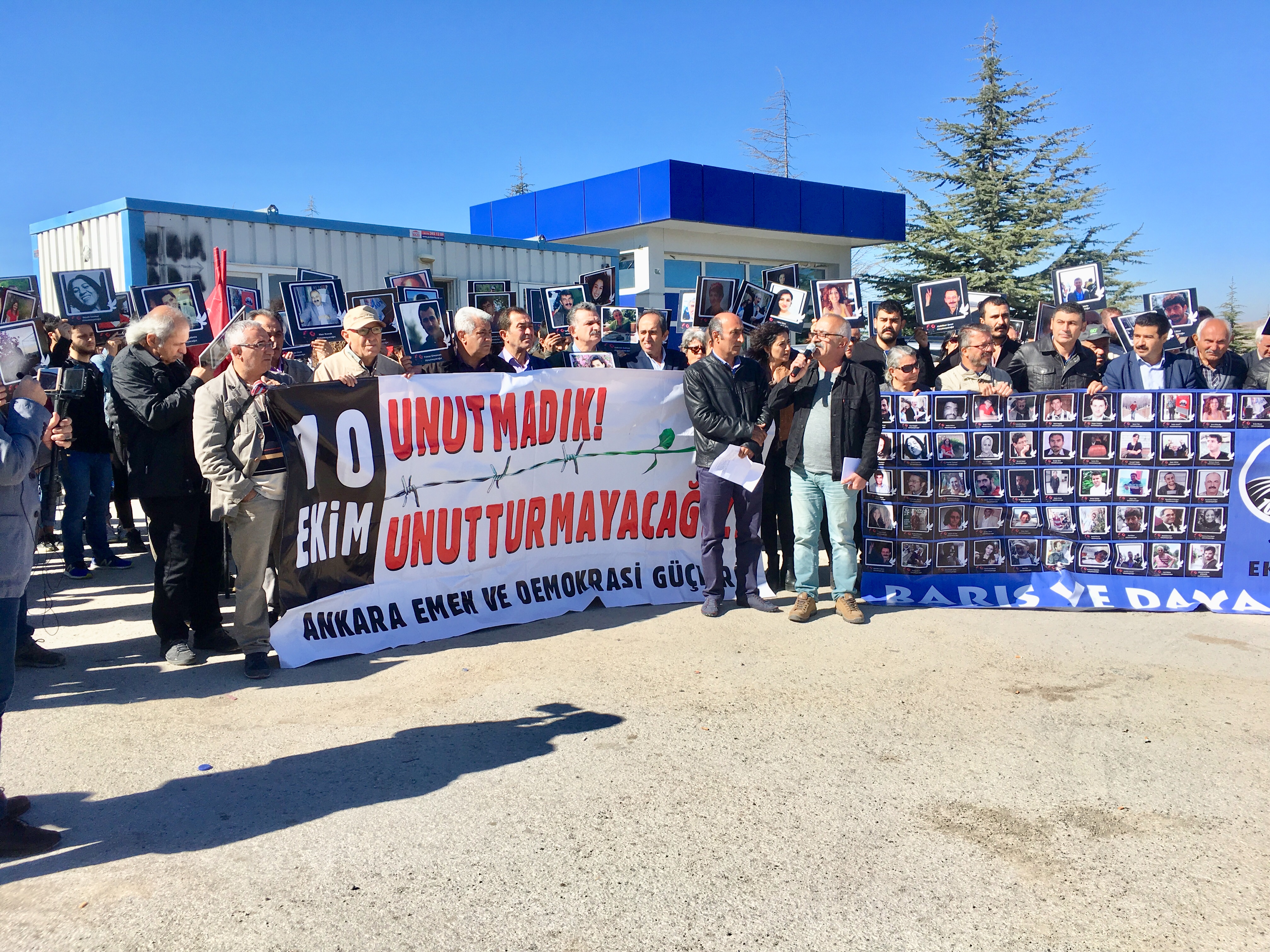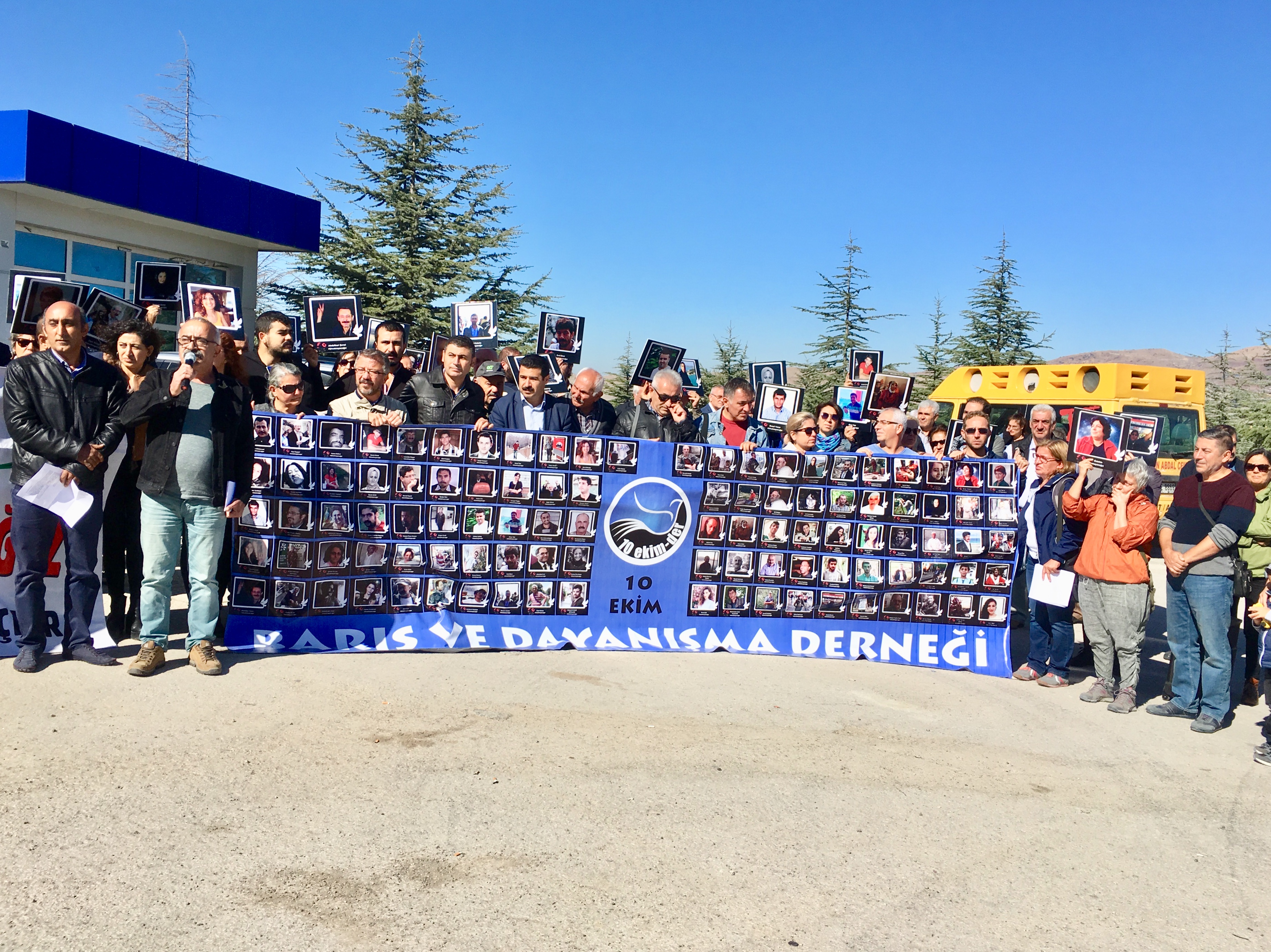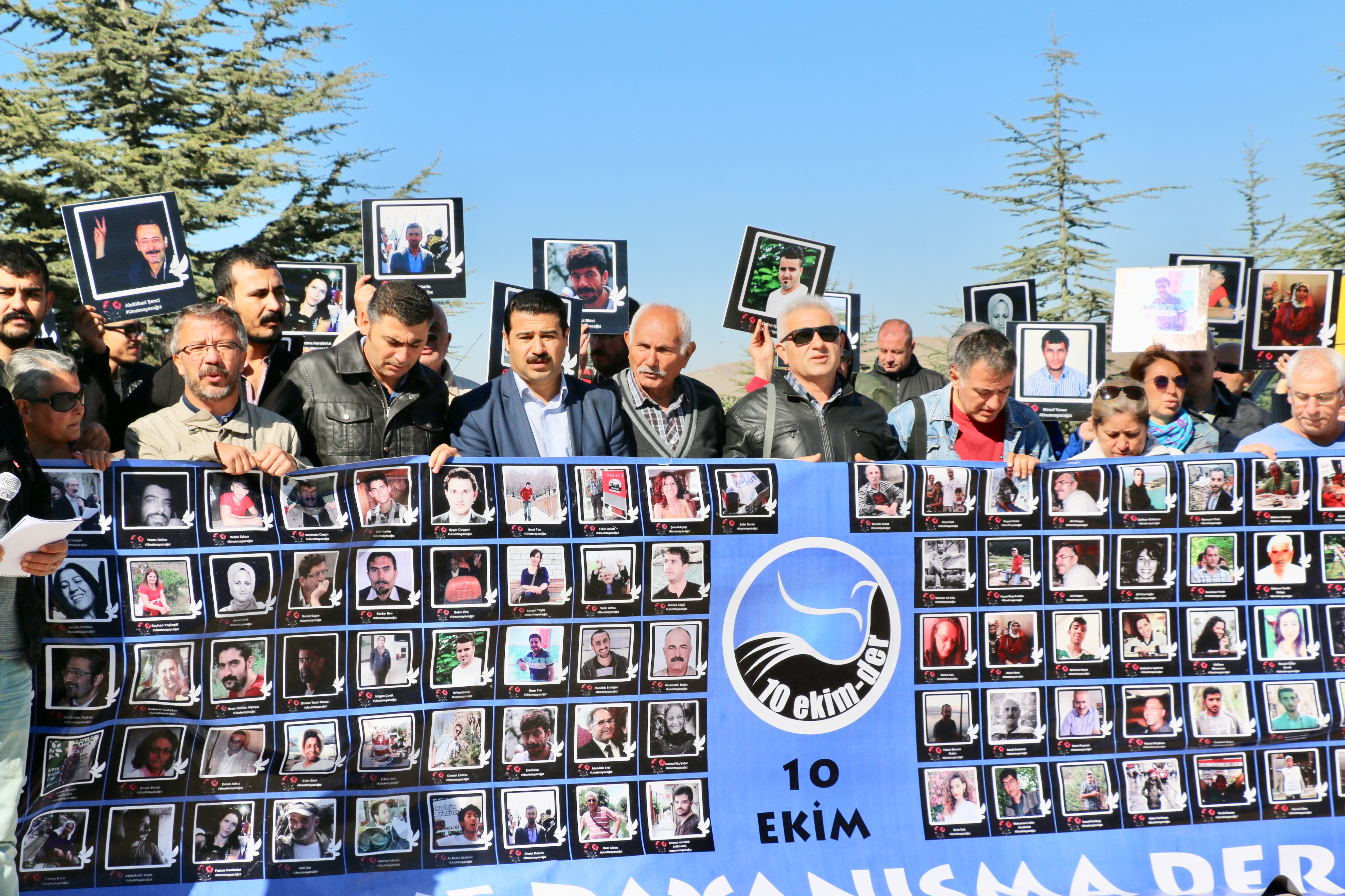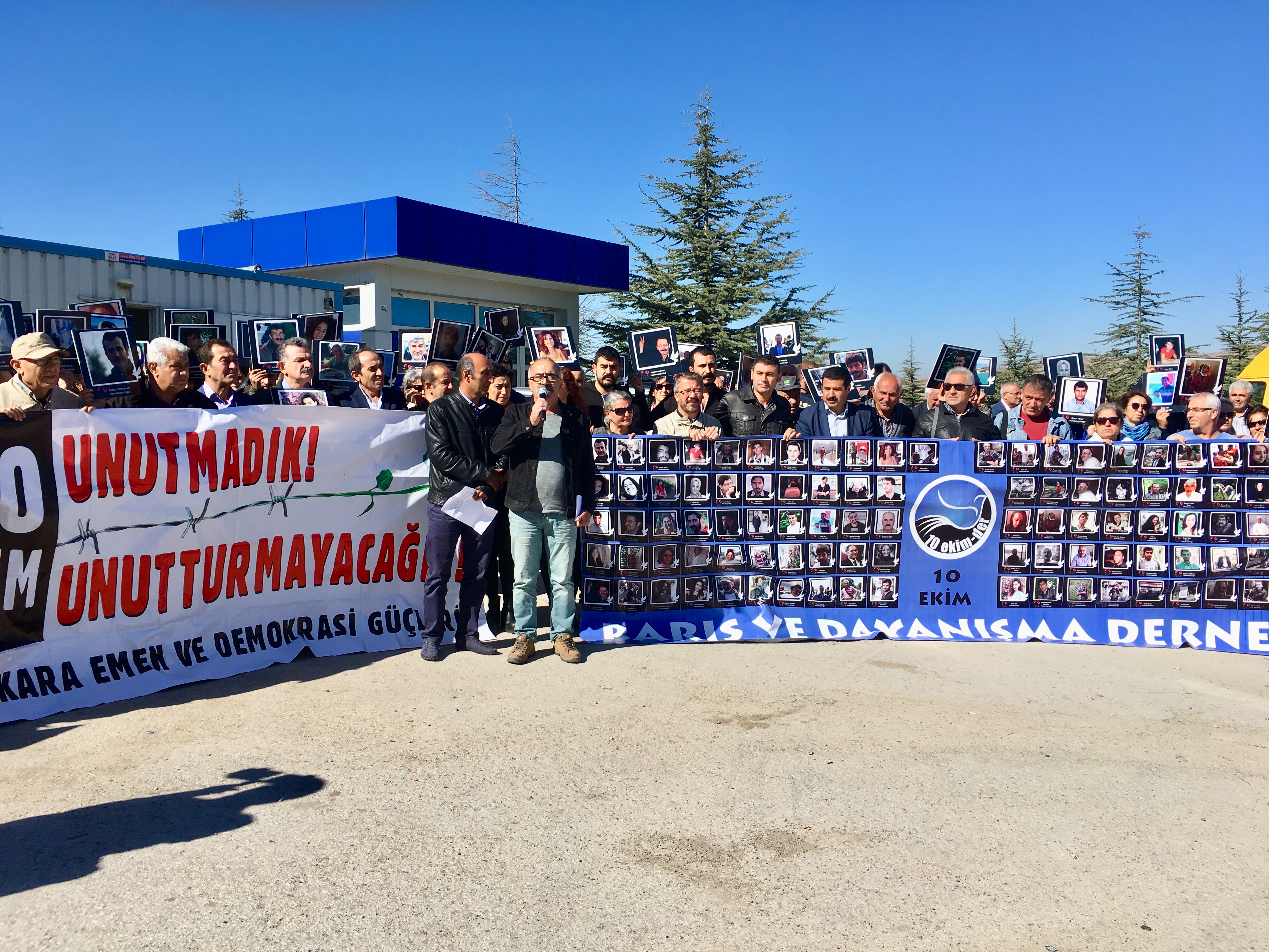 Ankara’da Karşıyaka mezarlığında 5 No’u kapıda bir araya gelen KESK, TMMOM, DİSK VE TTB ve 10 Ekim Derneği üyesi ile siyasi partiler temsilcisinin katılım gösterdiği anmada mezarlık ziyaretlerinden önce bir basın açıklaması gerçekleştirildi.