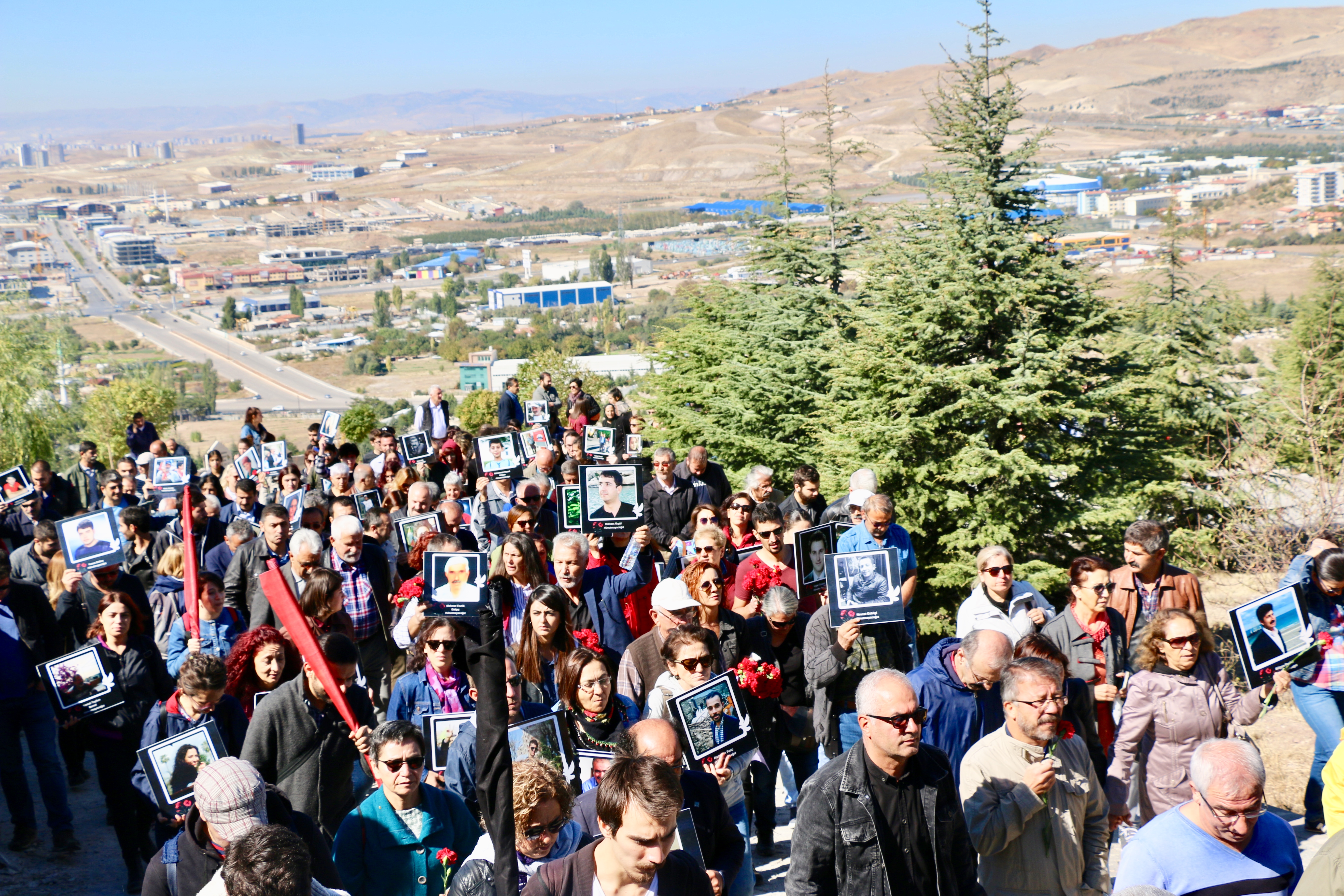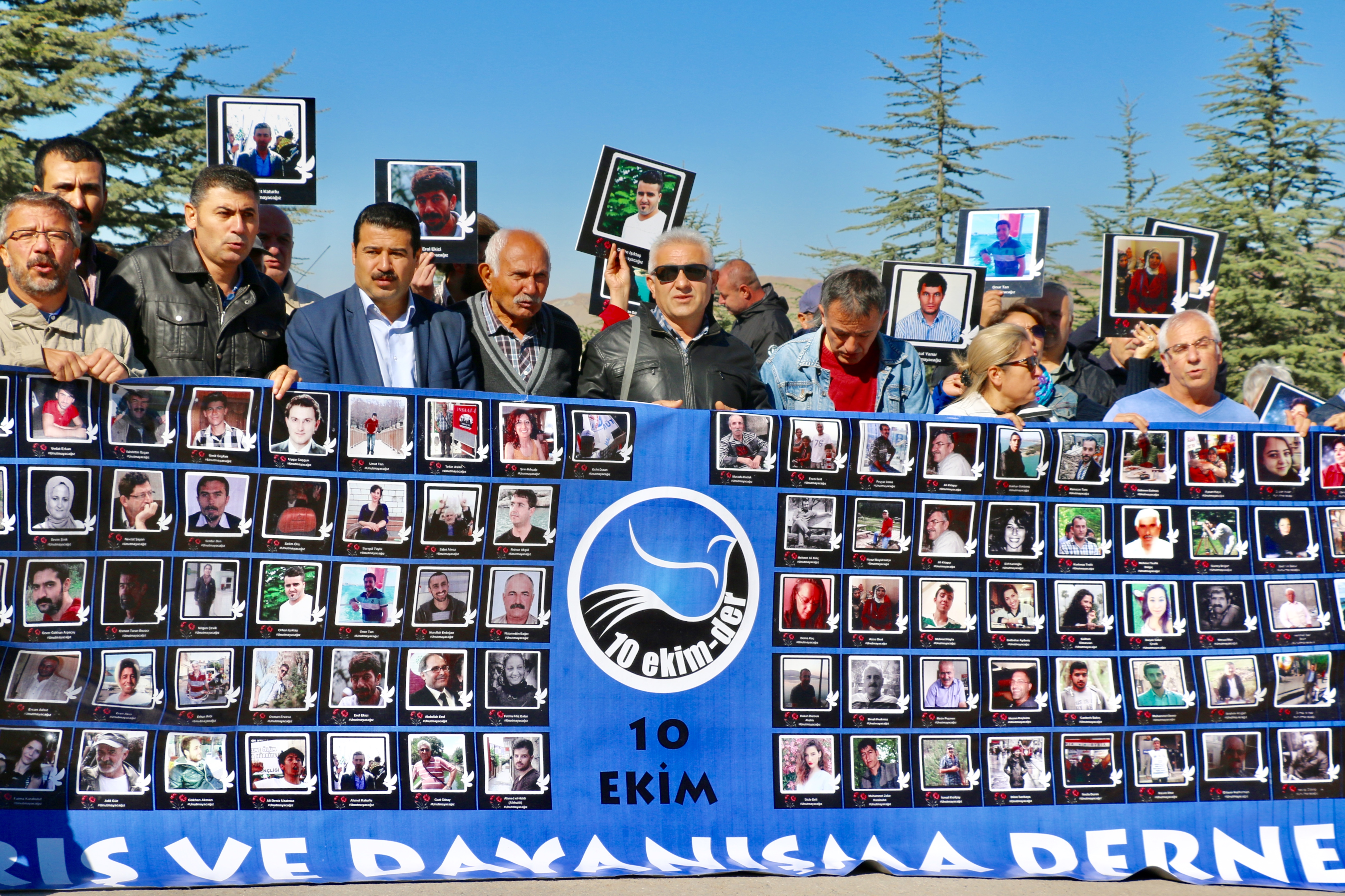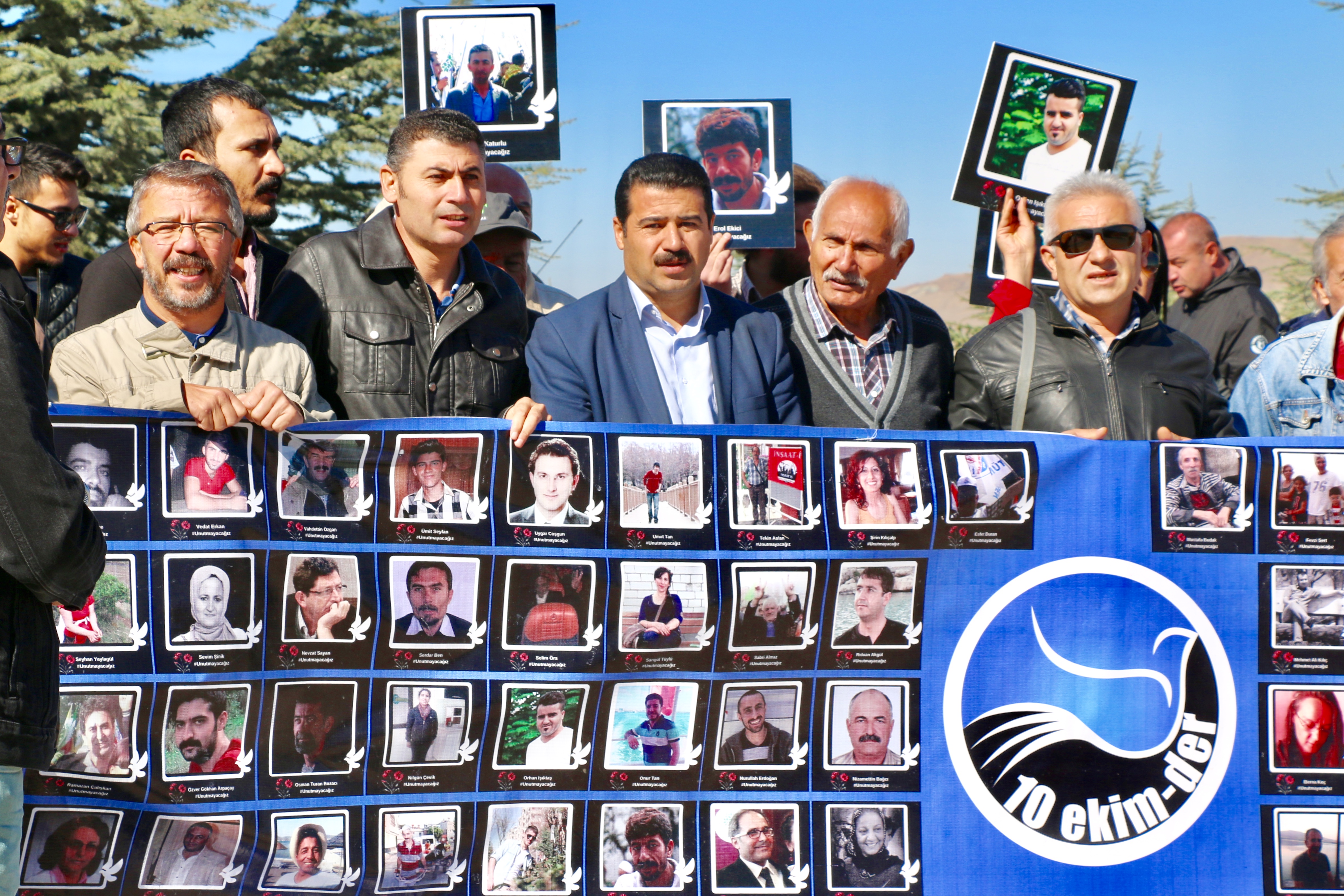 Ankara’da Karşıyaka mezarlığında 5 No’u kapıda bir araya gelen KESK, TMMOM, DİSK VE TTB ve 10 Ekim Derneği üyesi ile siyasi partiler temsilcisinin katılım gösterdiği anmada mezarlık ziyaretlerinden önce bir basın açıklaması gerçekleştirildi.