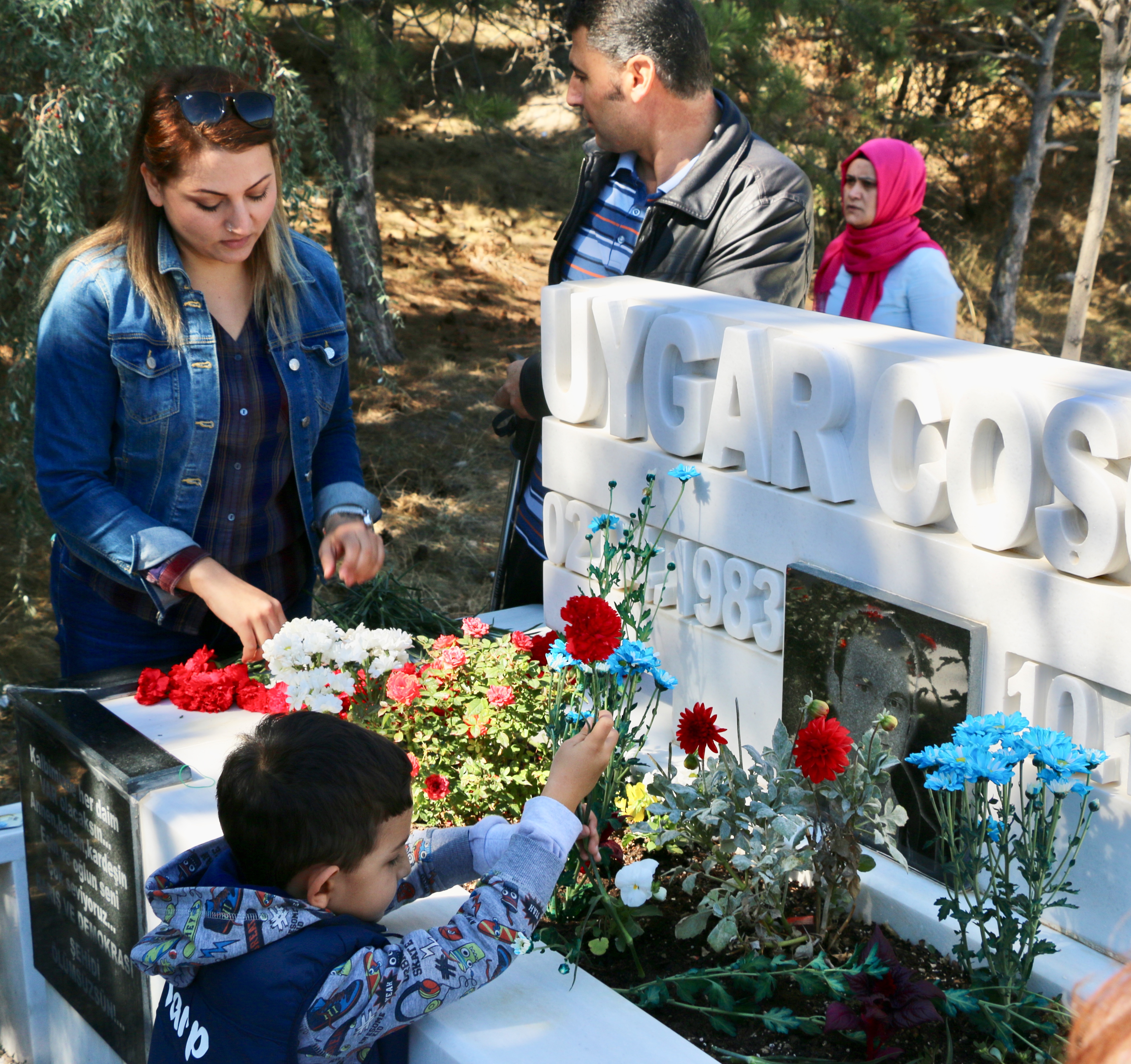 Daha sonra kitle pankartlarını açarak katliamda yaşamını yitiren BTS Birleşik Taşımacılık Sendikası Avukatı Uygar Coşgun’un mezarına gidildi. Burada bir konuşma yapan eşi Mehtap Sakinci Coşgun, “Her yıl buraya gelmeye devam edeceğiz. Bayramda, doğum gününde, yıl başında geliyoruz. Sarp (oğlu) burada babasının mezarı başında, iki yaşından beri burada. Mavi çiçekleri o getirdi. Babasının mezarı ile ilgileniyor. 10 Ekim de hayatını kaybeden Uygar Coşkun’un mücadelesini bizim gücümüzün yetmediği yerde tamamalayacak bir evladı var. Biz hayatımızın sonuna kadar buraya gelmeye devam edeceğiz. Sarp da babasının yoldaşlarını ve babasını anmaya devam edecek.” dedi.