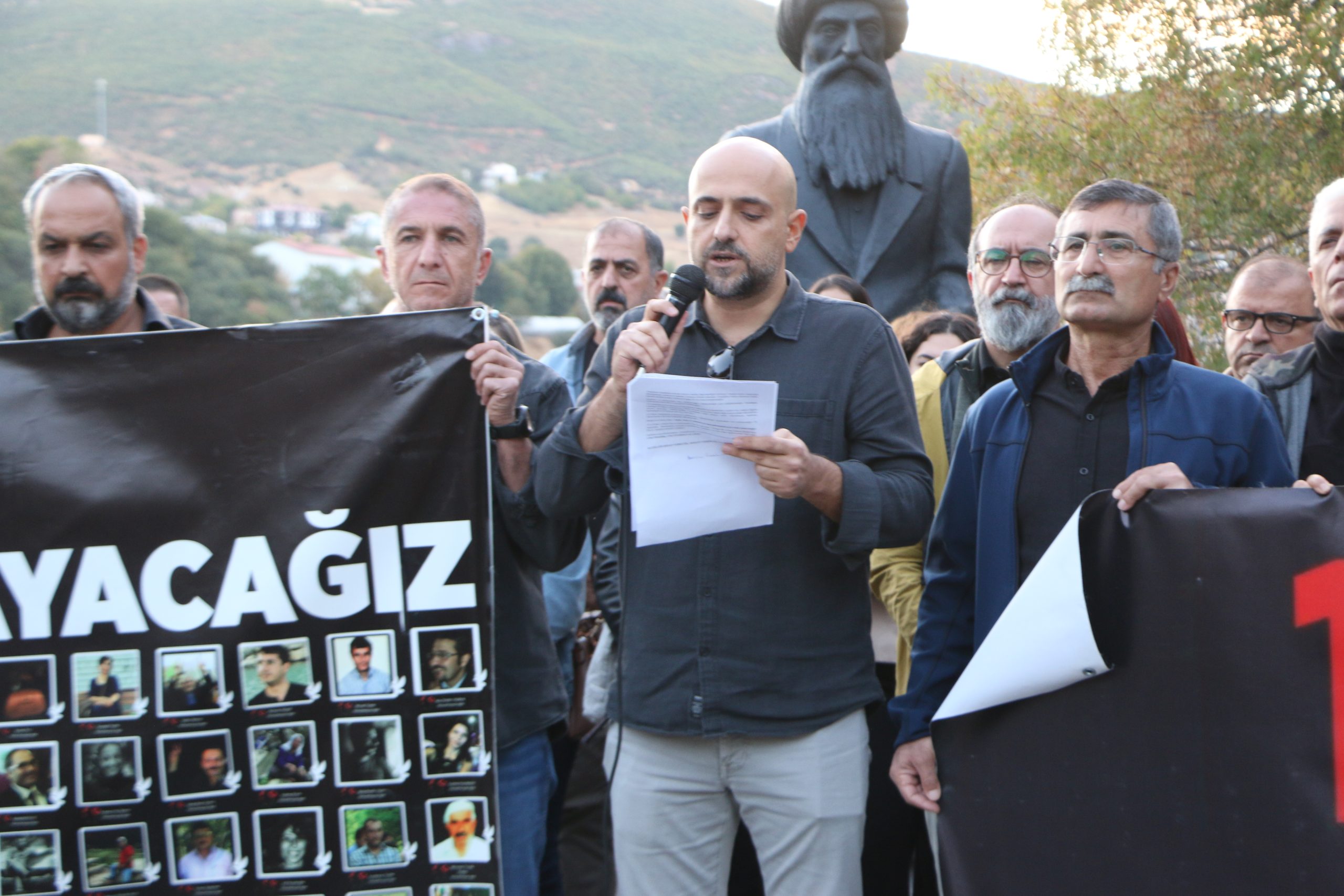 PİRHA-Dersim Emek ve Demokrasi Platformu, 10 Ekim Ankara Gar Katliamı’nın 10. yılında Seyit Rıza Meydanı’nda basın açıklaması yaptı. 10 Ekim katliamının üzerinin örtülmesine, unutturulmak istenmesine izin vermeyeceklerini vurgulayan Sinan Ulu, “10 Ekim davası biz bitti demeden bitmeyecek. Bedeli ne olursa olsun emek, barış ve demokrasi mücadelemizden geri adım atmayacağız” dedi.