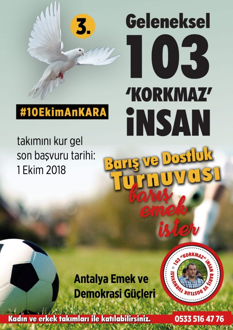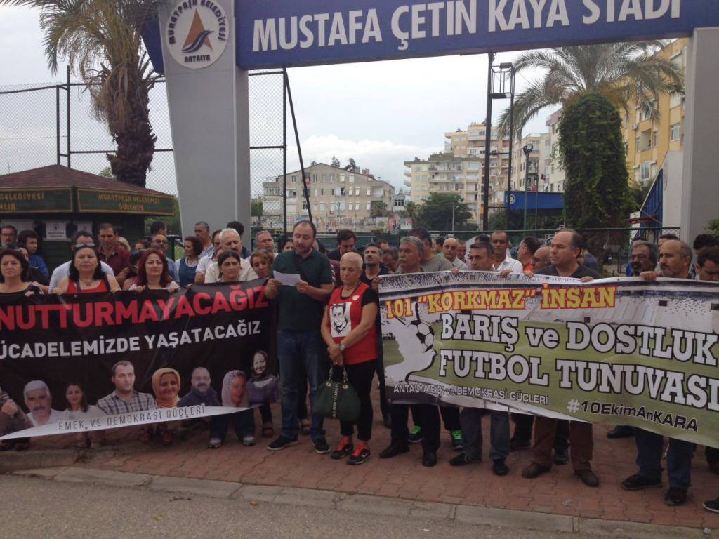 Antalya Emek ve Demokrasi Güçleri’nin organize ettiği ve 10 Ekim 2015’te Ankara Gar Katliamı anısına düzenlenen “101 Korkmaz İnsan Barış ve Dostluk Futbol Turnuvası” düzenlenecek.