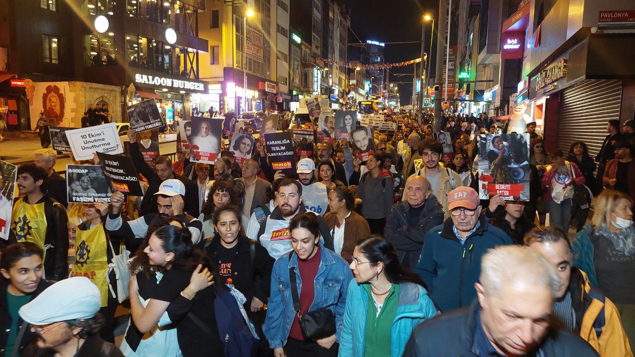 PİRHA – 10 Ekim Ankara Gar Katliamı’nda yaşamını yitirenler, İstanbul’da anıldı. Kadıköy İlçesinde yapılan yürüyüşün ardından yapılan basın açıklamasında “10 Ekim katliamının insanlık suçu sayılmaması, Sivas katliamında da insanlık suçu işleyenler zaman aşımı ile cezasız kaldığında ‘Hayırlı olsun’ diyerek bu cezasızlığı kutlayanları hatırlattı. Aradan geçen on yılda katliamın hemen ardından utanmadan, sıkılmadan oylarının yükseldiğini ifade eden siyasetçilere ‘ne demek istediği’ bile sorulmadı” denildi.
