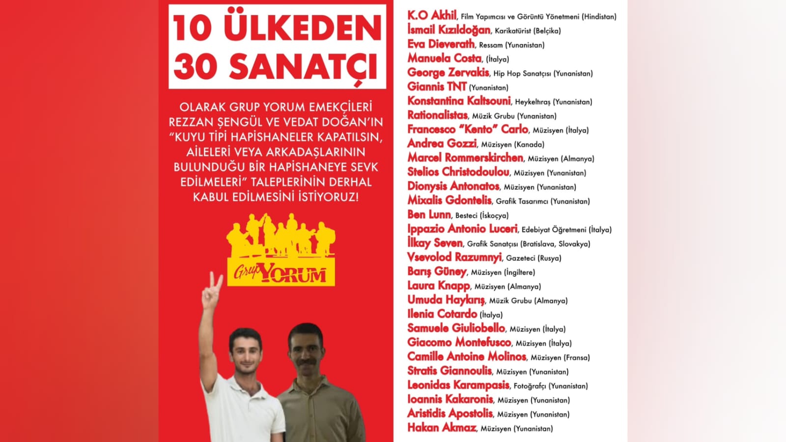 10 ülkeden 30 sanatçı, arkadaşlarının bulunduğu ve ailelerine yakın cezaevlerine sevk edilme talebiyle açlık grevinde olan Grup Yorum üyeleri Rezzan Şengül ve Vedat Doğan’ın taleplerine destek verdi. Sanatçılar tarafından yapılan açıklamada, “10 ülkeden 30 sanatçı olarak Grup Yorum emekçileri Rezzan Şengül ve Vedat Doğan’ın, kuyu tipi hapishanelerin kapatılması, aileleri veya arkadaşlarının bulunduğu bir hapishaneye sevk edilmeleri taleplerinin derhal kabul edilmesini istiyoruz” denildi.