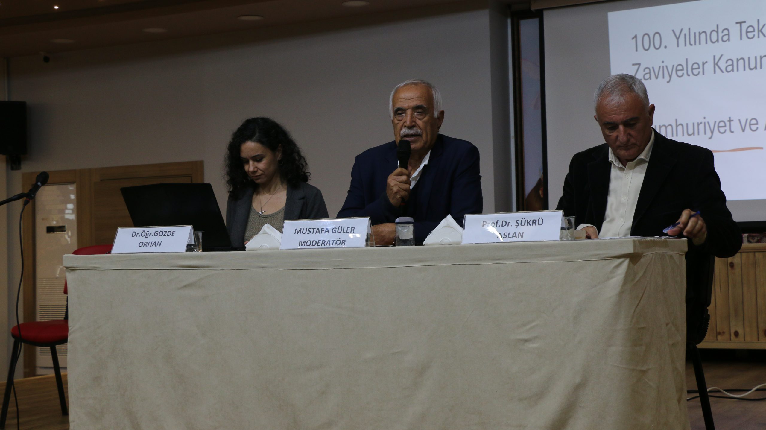 Panelde ilk olarak konuşan Dr. Gözde Orhan, 100. yılında Tekke ve Zaviyeler Kanunu- Cumhuriyet ve Aleviler başlıklı bir konuşma yaptı. Kanunun tarihçesine değinen Gözde Orhan, bunun ilk zamanlarda bir müjde havasında duyurulduğunu aktardı. Bütün inançların ‘büyü’ yapmakla aynı kefeye koyulduğunu ve o dönemde çok ciddi bir baskı olduğu için güçlü bir itiraz olmadığını aktaran Orhan, şunları söyledi: