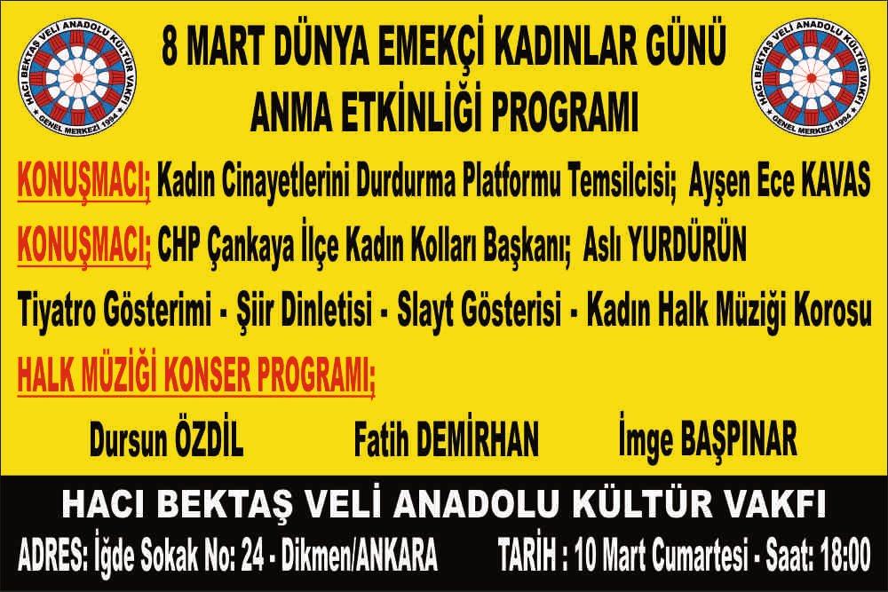 Hacı Bektaş Veli Anadolu Kültür Vakfı (HBVAKV) Dünya Emekçi Kadınlar Günü dolayısıyla anma etkinliği düzenliyor.