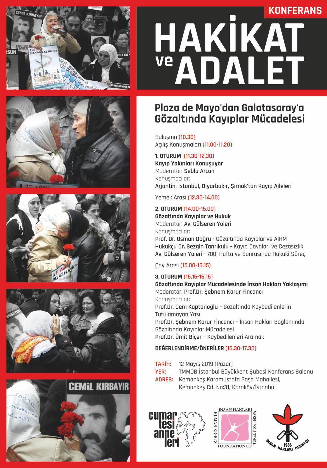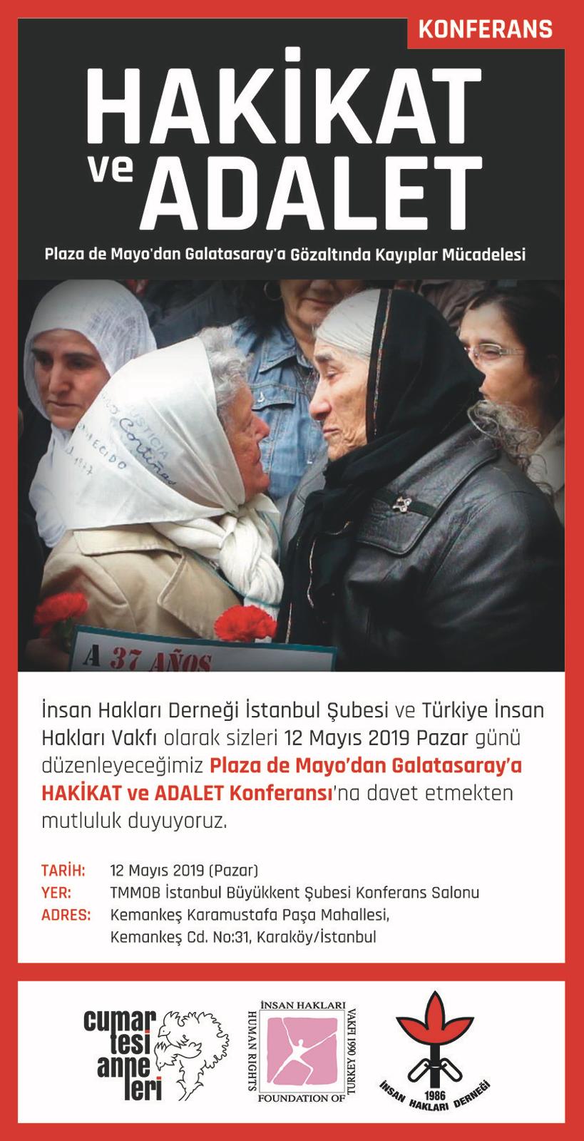 İnsan Hakları Derneği İstanbul Şubesi ve Türkiye İnsan Hakları Vakfı’nın düzenlediği Plaza de Mayo’dan Galatasaray’a Gözaltında Kayıplar Mücadelesini anlatan ‘Hakikat ve Adalet’ konferansı düzenliyor. 12 Mayıs Pazar günü TMMOB İstanbul Büyükkent Şubesi Konferans Salonu’nda yapılacak konferans üç oturumdan oluşuyor.