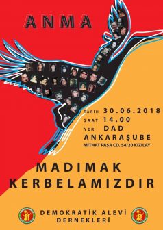 Madımak şehitleri anılıyor. Demokratik Alevi Derneği (DAD) Ankara Şubesi 30 Haziran saat 14:00’te 2 Temmuz 1993 yılında Sivas’ta yanarak can veren 33 canı anacak. DAD Ankara Şube binasında yapılacak olan anmada şehitler için çerağ uyandırılıp deyişler ve duazlar okunacak.
