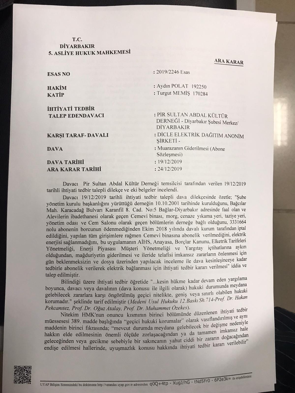 Borçları nedeniyle elektrik aboneliği iptal edilen Pir Sultan Abdal Kültür Derneği’ne bağlı Diyarbakır Cemevinin aboneliğinin yenilenmesi için mahkemeye yapılan “ihtiyatı tedbir” talebi reddedildi.