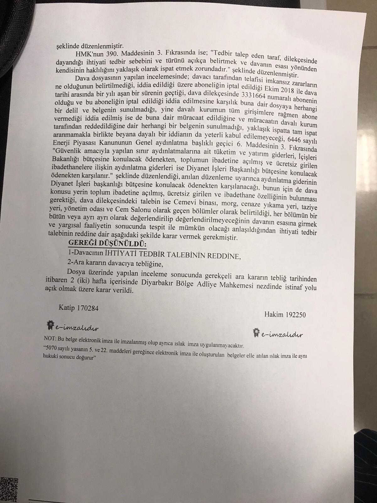 Bunun üzerine derneğin başkanı Avukat Cafer Koluman, DEDAŞ aleyhine Diyarbakır Nöbetçi Asliye Hukuk Mahkemesi’nde “İhtiyati tedbir’ talebiyle dava açtı.