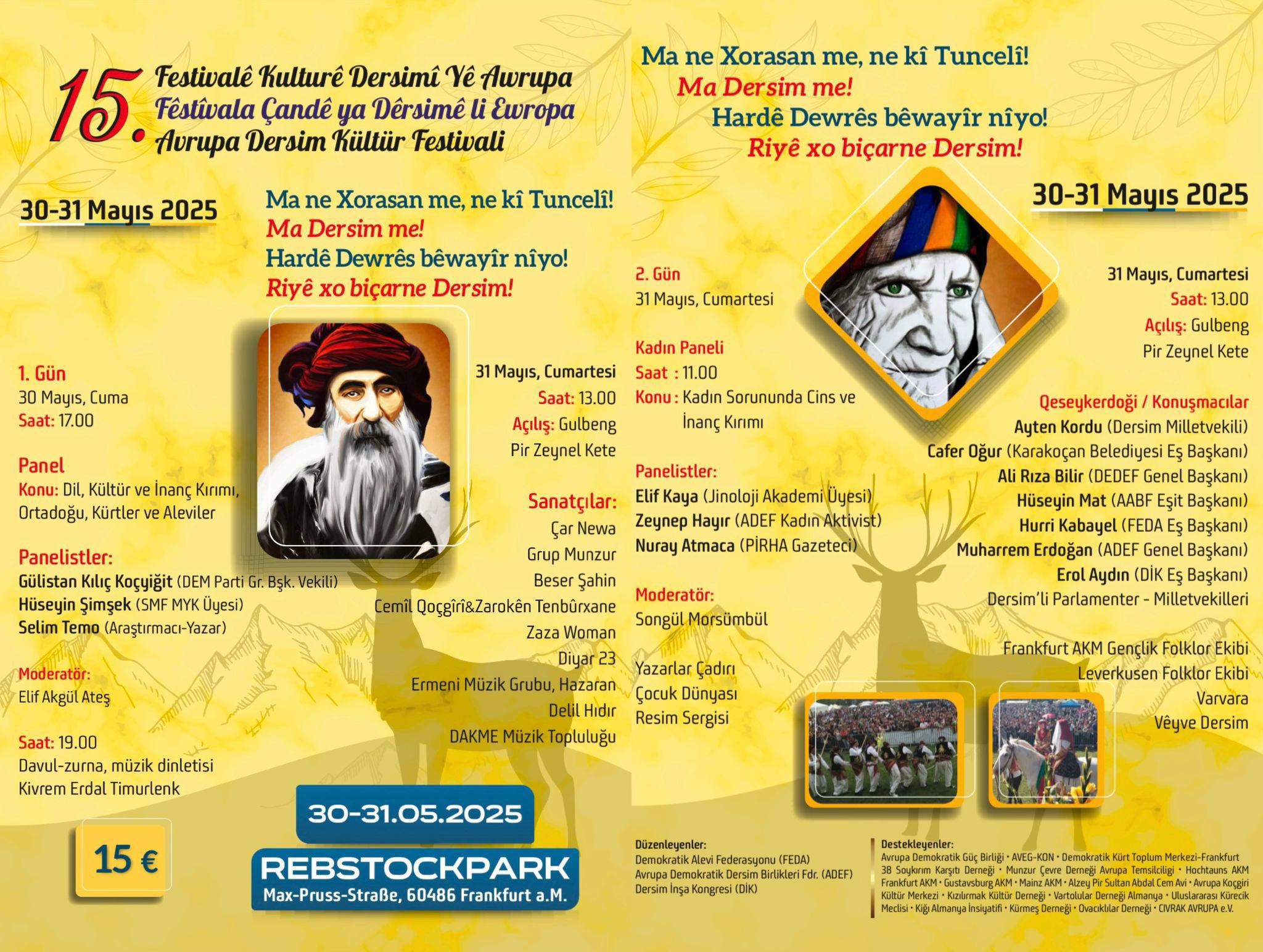 Demokratik Alevi Federasyonu (FEDA), Avrupa Demokratik Dersim Birlikleri Federasyonu (ADEF) ve Dersim İnşa Kongresi (DİK) öncülüğündeki 15. Avrupa Dersim Kültür Festivali, 30-31 Mayıs tarihlerinde Frankfurt Rebstockpark’ta gerçekleştirilecek.