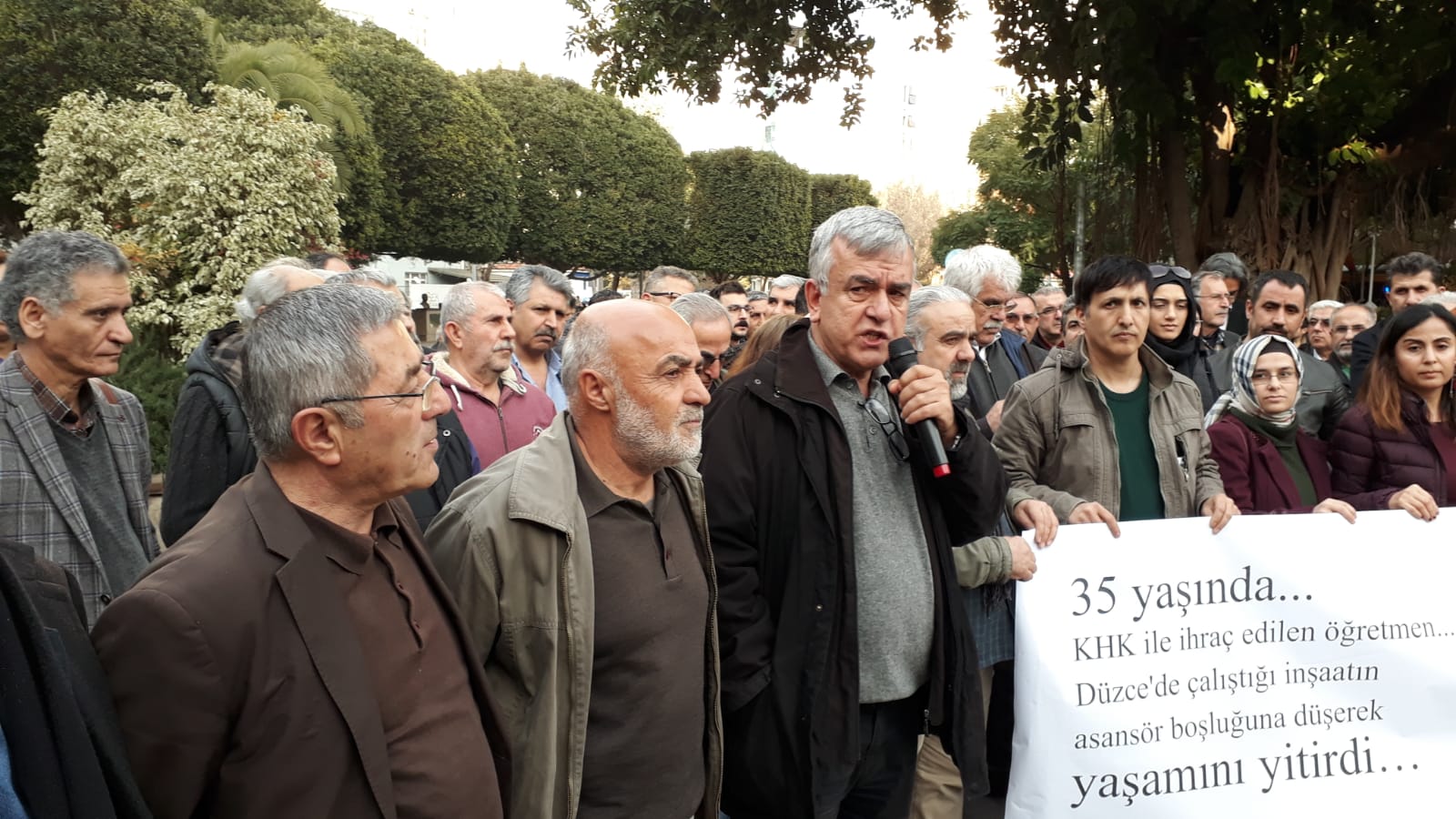 PİRHA-Adana’da Eğitim Sen, İHD Adana Şubeleri ve KHK Mağdurları, inşaatta düşerek yaşamını yitiren ihraç edilen öğretmen Kazım Kurnaz için basın açıklaması yaptı. Açıklamada Kurnaz’ın ölümün sorumlusunun hukuku işletmeyen siyasi iktidar olduğu belirtildi.