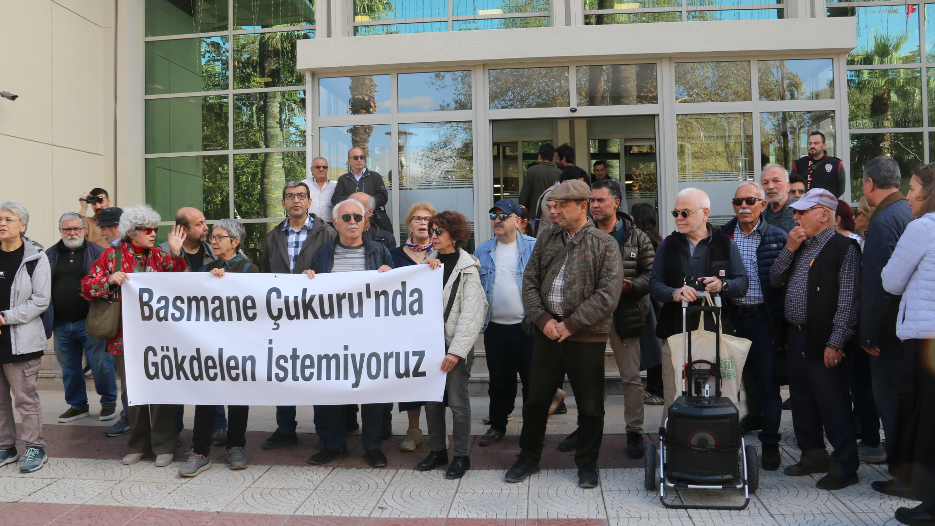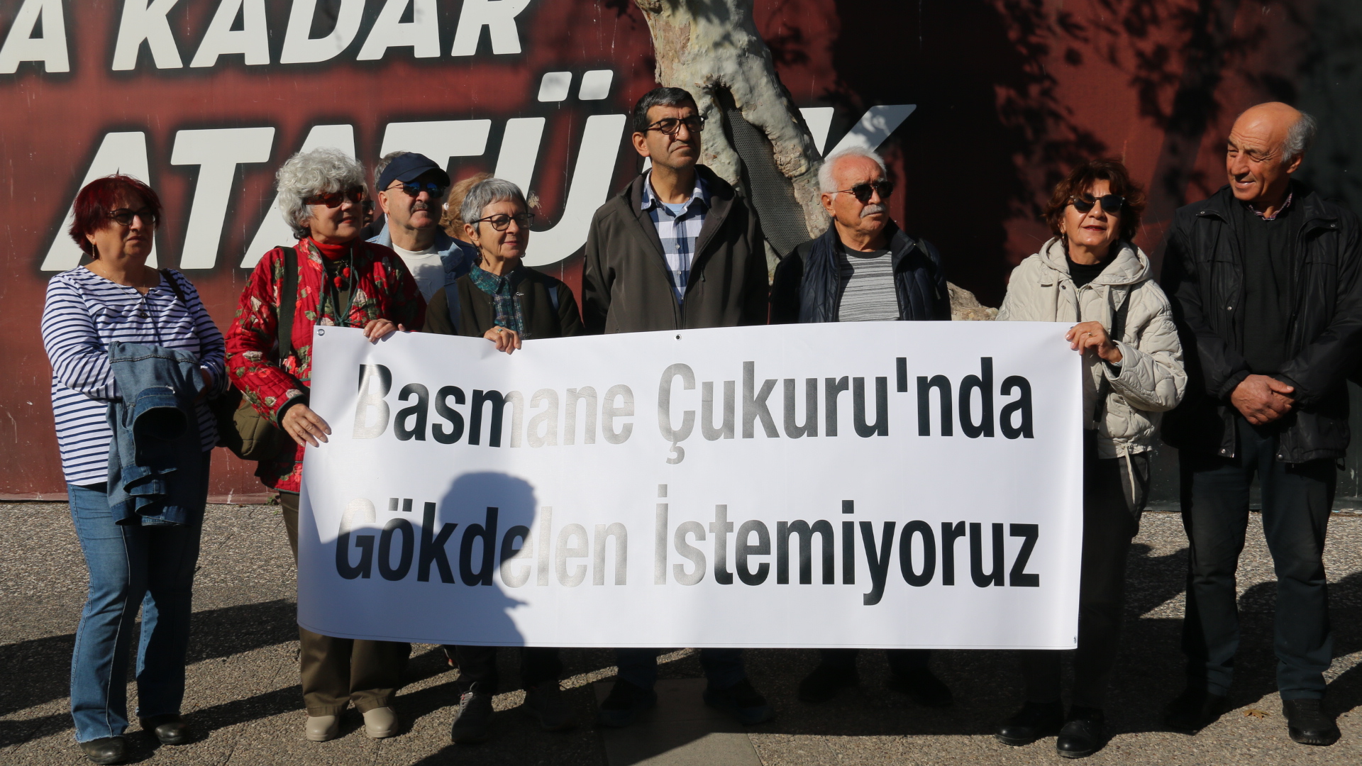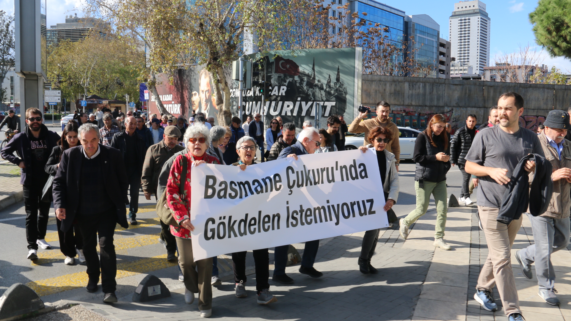 Basmane Çukuru önünde düzenlenen açıklamada, inşaat süreci yıllardır tartışma konusu olan bölgeye ilişkin Kültür Varlıklarını Koruma Bölge Kurulu’nun yeni kararı hatırlatıldı. Kurul, yapının yüksekliğini 84 metre ile sınırlandırmış, ardından hazırlanan yeni plan İzmir Büyükşehir Belediyesi Meclisi gündemine getirilmişti.