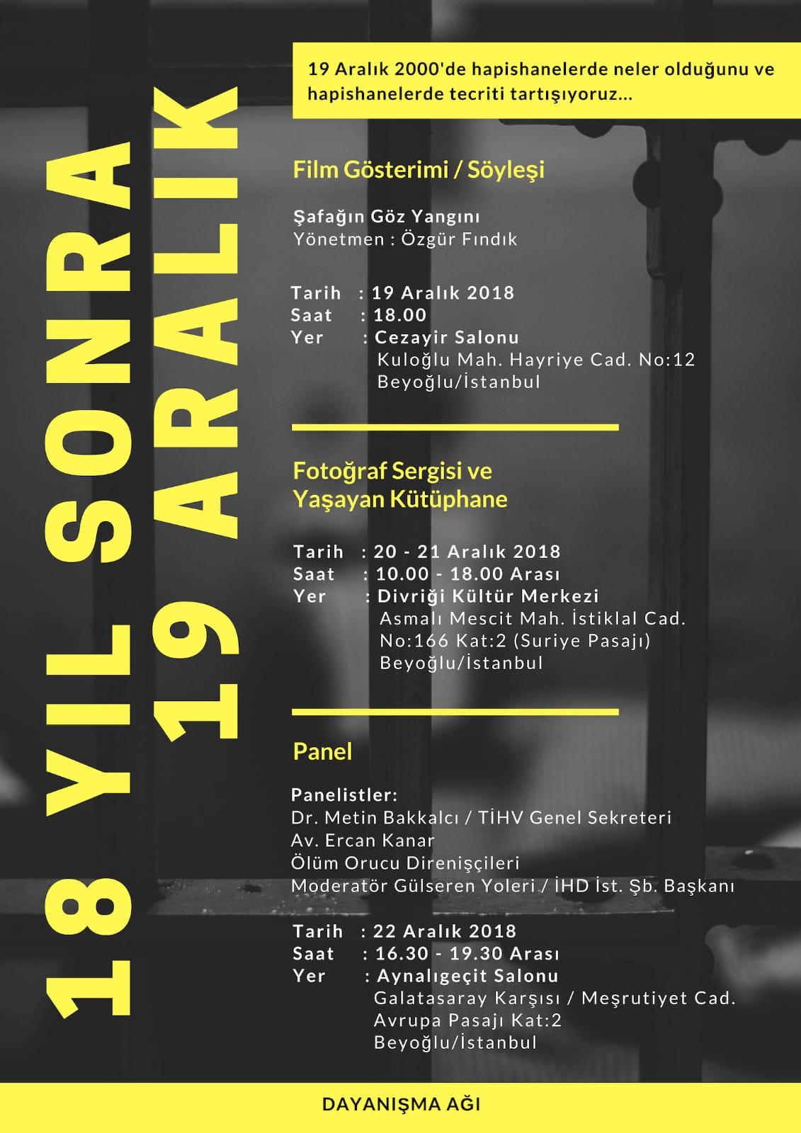 Birçok kurumun desteği ile birlikte Dayanışma Ağı’nın düzenlediği ’18 yıl sonra 19 Aralık’ adı ile düzenlenen etkinliğin detayları şöyle: