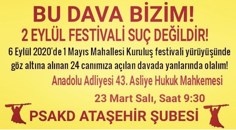 “1977 de devrimcilerin yoksul emekçi halk ile birlikte can pahasına, bedeller ödeyerek 12 canını yitirerek, oluşturduğu 1 Mayıs Mahallesi’nin kuruluş yıl dönümü her yıl 2 Eylül’de festivallerle, yürüyüşlerle anılır, bu değer korunur. Gelinen aşamada 24 canımıza savcılık tarafından dava açılmıştır. Bu davanın ilk duruşması 23 Mart Salı günü, saat 9.30 da Anadolu Adliyesi 43. Asliye Hukuk Mahkemesi’nde görülecektir. Tüm kamuoyunu bu davaya sahip çıkmaya, hukuksuzluğa karşı hukuku, ranta ve talana karşı yaşam alanlarımızı savunan canlarımızın yanında olmaya çağırıyoruz.”