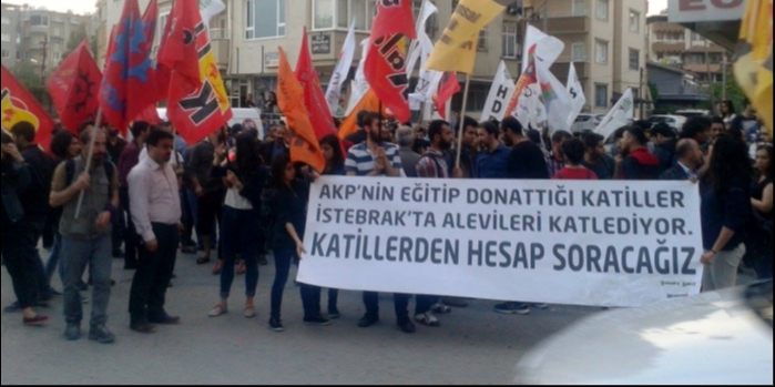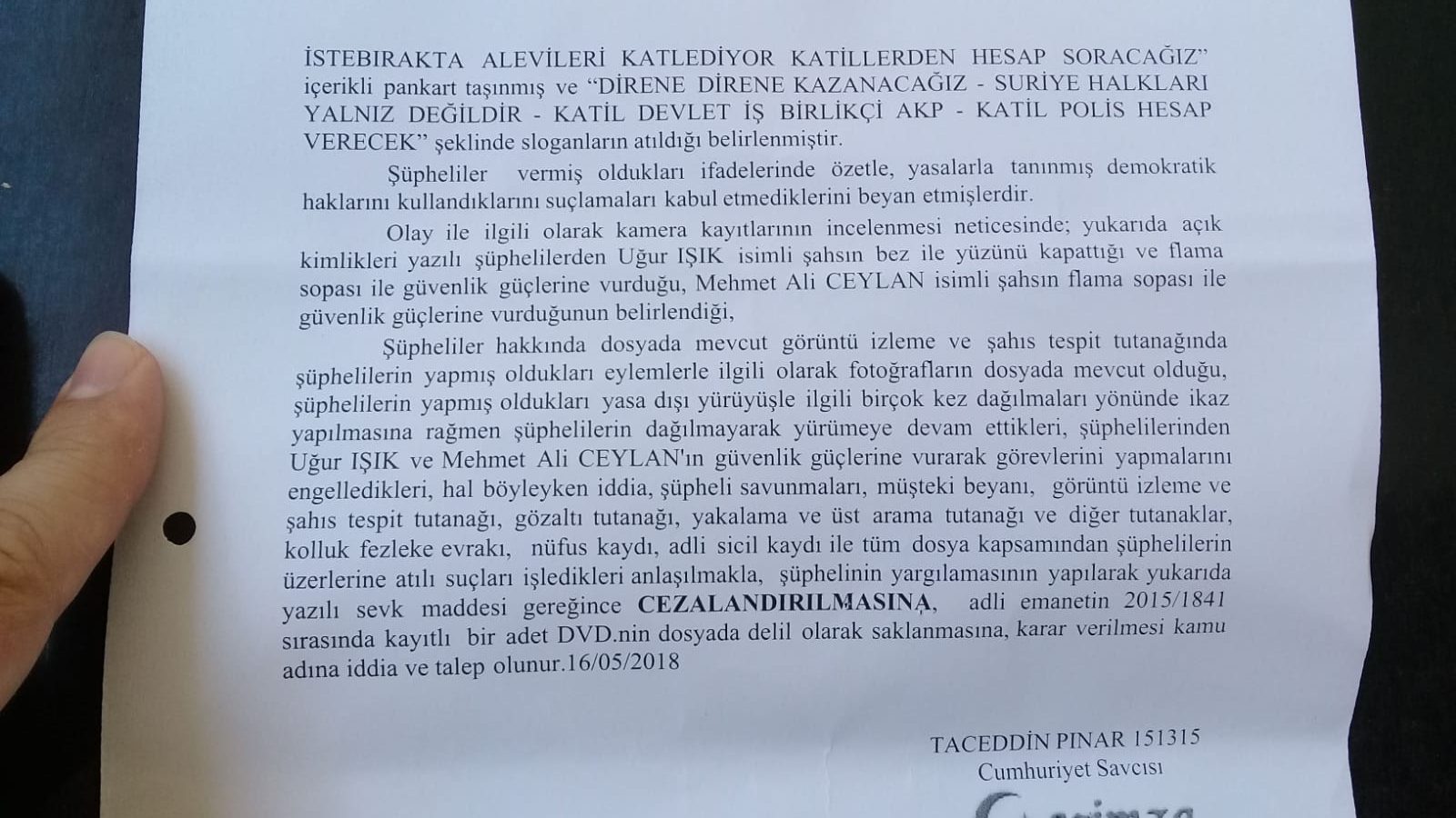 Toplantı ve gösteri yürüyüşleri kanunu 32/1 tck 53. maddeleri gereğince açılan davada yürüyüş esnasında “AKP’nin eğitip donattığı katiller İstebırak’da Alevileri katlediyor, katillerden hesap soracağız” pankartının grup tarafından taşındığı ve “Direne direne kazanacağız- Suriye halkları yanlız değildir- Katil Devlet iş birlikçi AKP- Katil polis hesap verecek” gibi sloganların atıldığı belirtildi.
