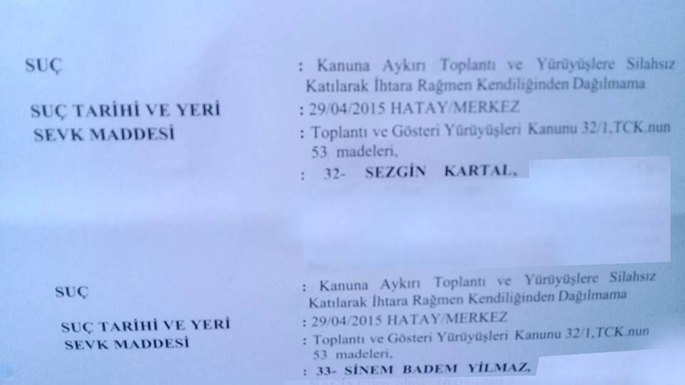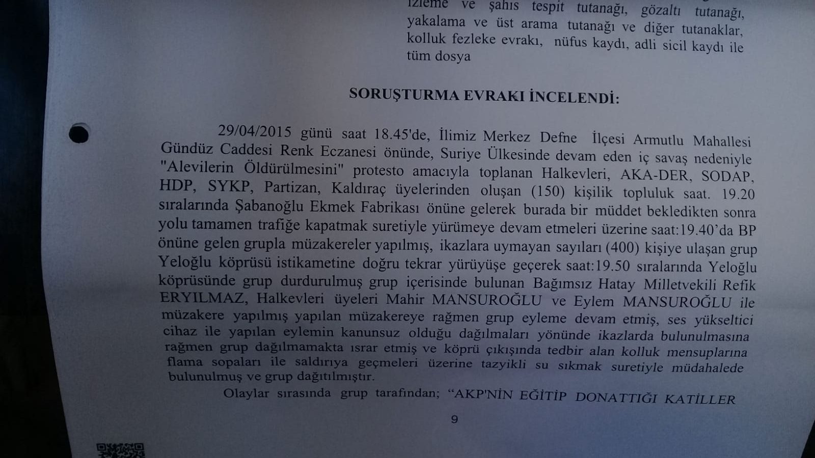 29/04/2015 tarihinde Hatay’ın Defne İlçesi Armutlu Mahallesi’nde Suriye’de devam eden iç savaş nedeniyle “Alevilerin Öldürülmesini” protesto amacıyla toplanan Halkevleri, AKA-DER. SODAP. HDP, SYKP, Partizan, Kaldıraç üyelerinden oluşan (150) kişilik topluluktan 37 kişi hakkında dava açıldı.