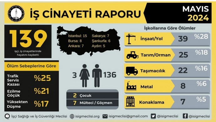 Mayıs ayı verilerinin de yer aldığı İSİG Meclisi raporunda, Mayıs ayında 139 işçinin yaşamını yitirdiğini belirtirken, bu ayda en çok iş cinayetinin yaşandığı kentlerin başında 15 işçi ölümü ile İstanbul olurken, Bursa 8, Ankara 7, Urfa 6 ve Aydın 5 olarak açıklandı.