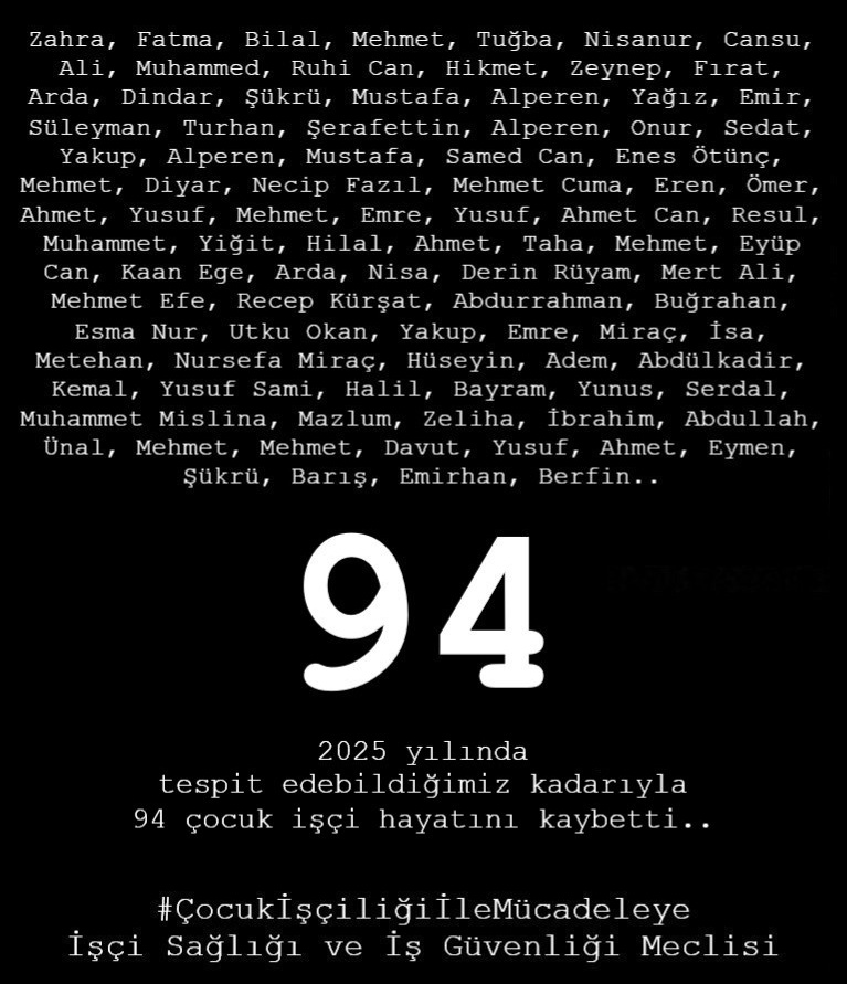 PİRHA – İşçi Sağlığı ve İş Güvenliği Meclisi (İSİG), 2025 yılı boyunca en az 94 çocuk işçinin çalışırken hayatını kaybettiğini açıkladı. İSİG Meclisi’nin verilerine göre, son 13 yılda iş cinayetlerinde yaşamını yitiren çocuk sayısı 836’ya ulaştı.