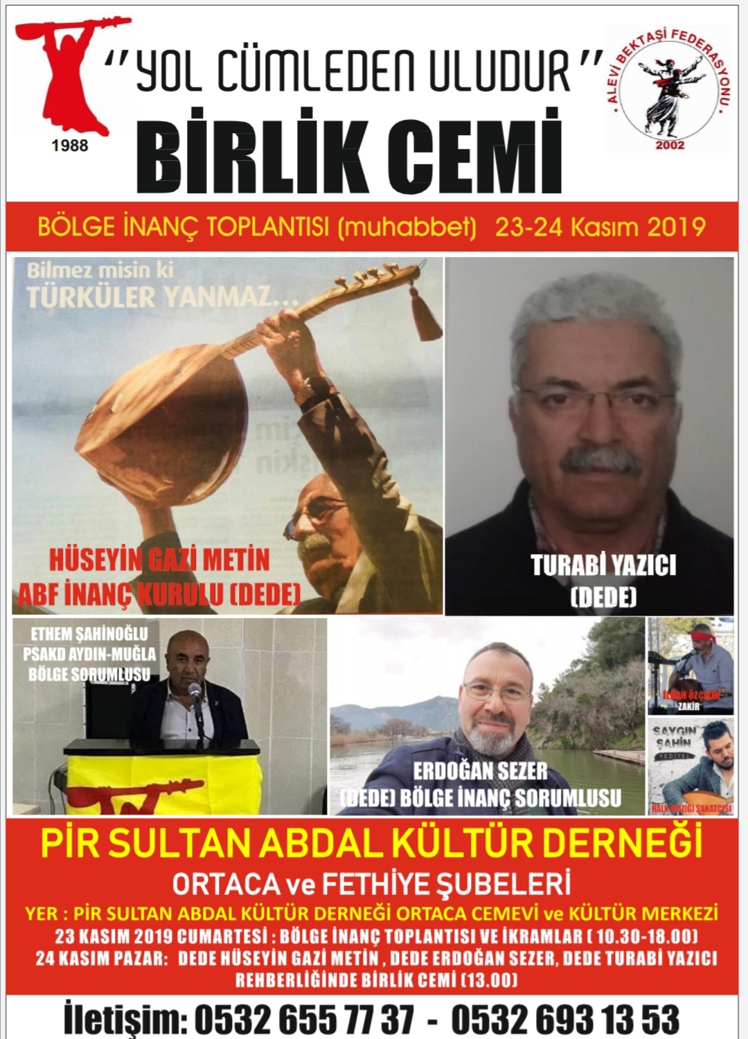 PİRHA- Pir Sultan Abdal Kültür Derneği Ortaca ve Fethiye Şubeleri “Yol cümleden uludur” şiarı bölge inanç toplantısı ve birlik cemi gerçekleştirecek.