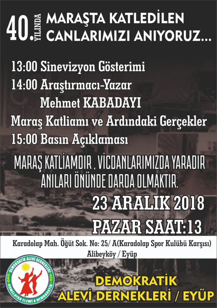 Demokratik Alevi Derneği Eyüp Şubesi, 23 Aralık Pazar günü, Maraş Katliamı’nda hayatını kaybedenleri anacak. Dernek binasında yapılacak anmada, kısa bir sinevizyon gösteriminin ardından Araştırmacı Yazar Mehmet Kabadayı, Maraş Katliamı’nı ve ardındaki gerçekleri anlatacak.