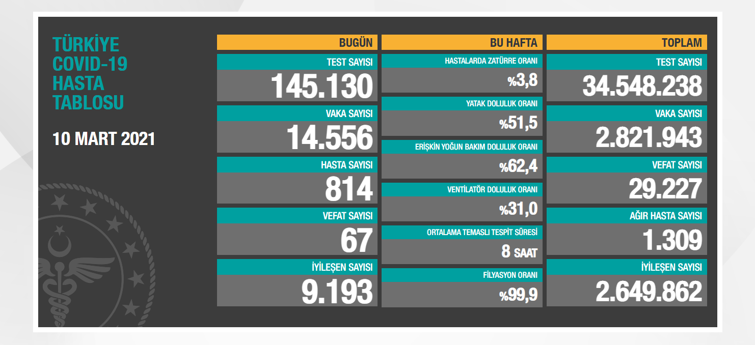 Sağlık Bakanlığı günlük koronavirüs verilerini açıkladı. Buna göre Türkiye’de son 24 saatte, 67 kişi yaşamını yitirdi, 14 bin 556 yeni vaka tespit edildi.