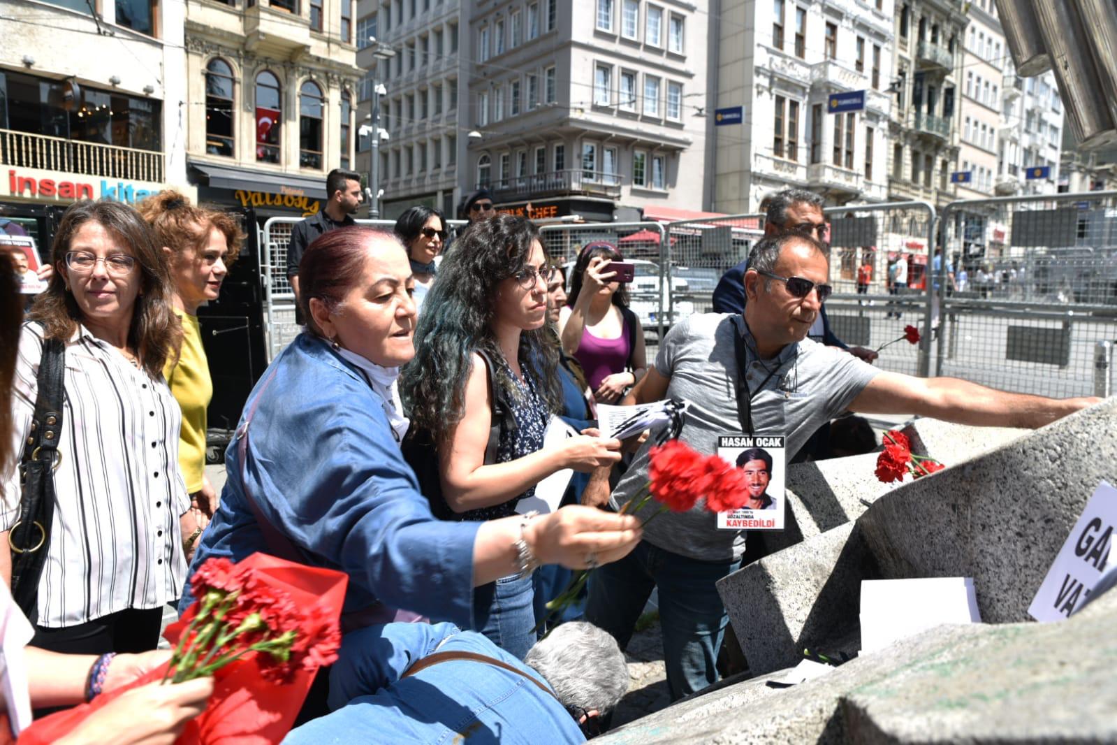 Cumartesi Anneleri Galatasaray’a çıkışlarının 24’ncü yılında Galatasaray meydanına karanfil bıraktı. Kayıp yakınları etrafı barikatlarla çevrili Galatasaray meydanı için de adalet talebinde bulunarak, “Kayıplarımızla buluşma mekanımız olan Galatasaray meydanından vazgeçmeyeceğiz” dedi.