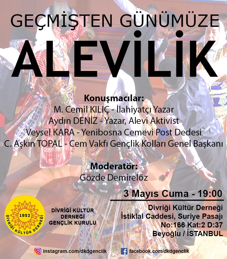 İstanbul Divriği Kültür Derneği Gençlik Kurulu, 3 Mayıs’da ‘Geçmişten günümüze Alevilik’ paneli düzenliyor. Moderatörlüğünü Gözde Demirelöz’ün yaptığı panelde İlahiyatçı- Yazar M.Cemil Kılıç, Alevi Aktivist Aydın Deniz, Yeni Bosna Cemevi Post Dedesi Veysel Kara, Cem Vakfı Gençlik Kolları Genel Başkanı C. Aşkın Topal konuşmacı olarak yer alacak.