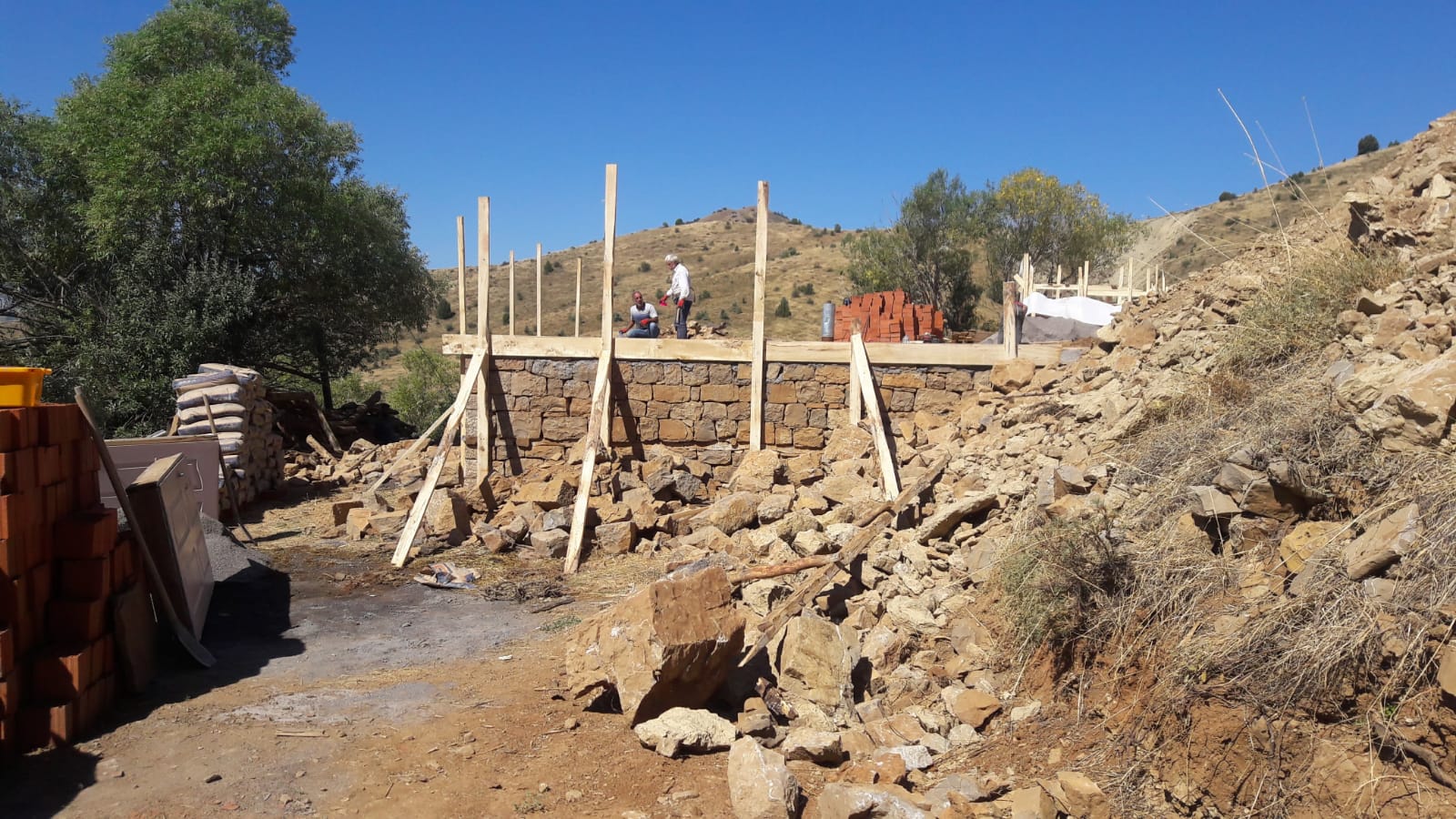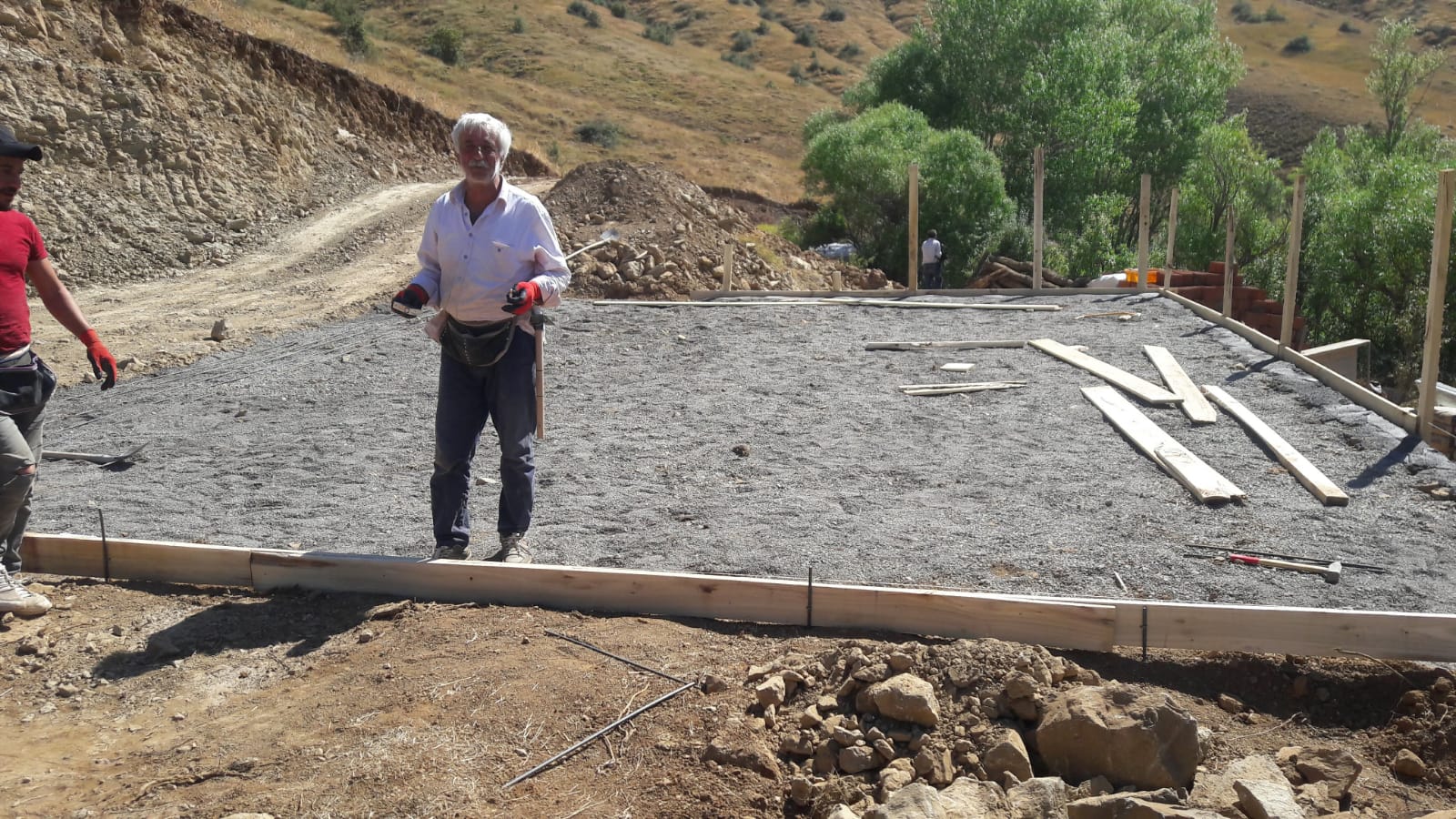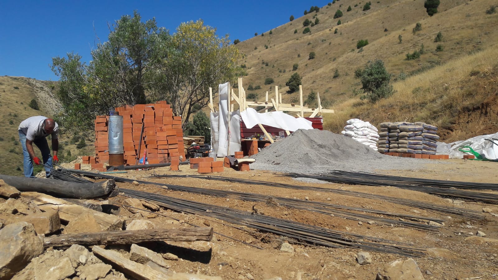 İki aydır köyde çadır kurup kalan Arı, köyde ev yapımı için inşaata başlamış.