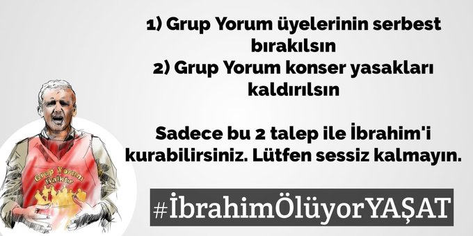 Halkın Hukuk Bürosu, “Talepleri çok basit. 1- Konser günü verilsin, 2- Tutsak Grup Yorum üyeleri serbest bırakılsın. Yani sadece kendi hukukunuzu uygulayın, İbrahim’in de katili olmayın! #İbrahimÖlüyorYAŞAT” diyerek hükümete çağrı yaptı.