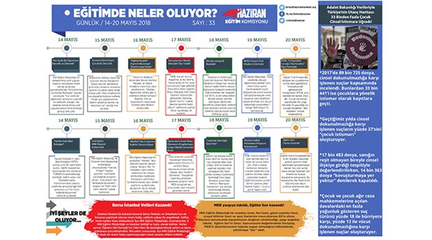 Adalet Bakanlığı verileri ile Türkiye’de çocuklara uygulanan cinsel istismarı gözler önüne seren raporda, 14-20 Mayıs haftasında basında çıkan haberlere dair hazırlanan raporda eğitim panoraması çıkarıldı.