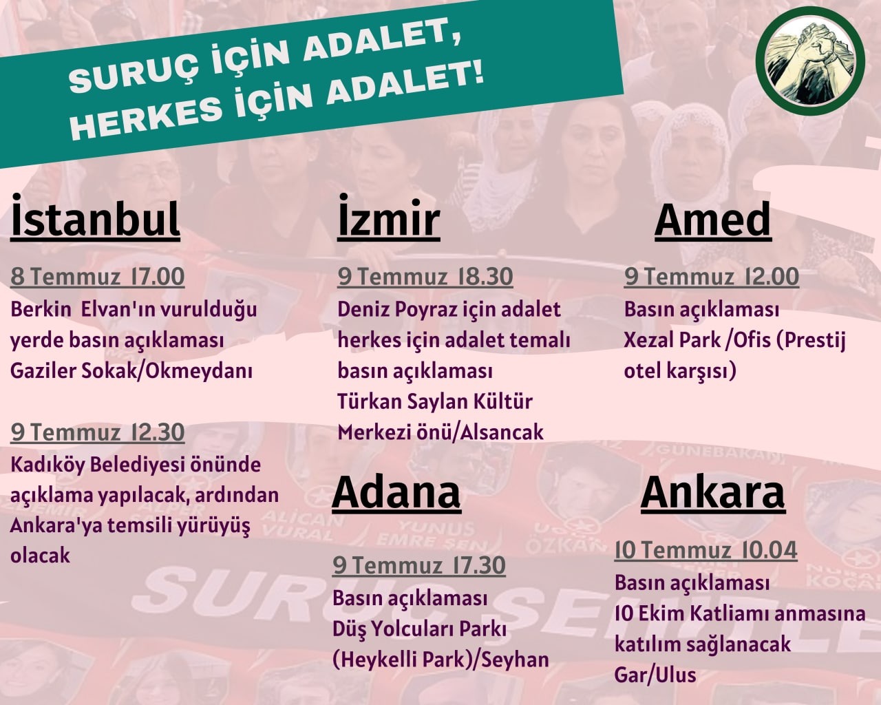Katliamın 6. yılı yaklaşırken, Suruç İçin Adalet Herkes İçin Adalet talebi yükseltiliyor. Bu kapsamda, 8, 9 ve 10 Temmuz’da İstanbul, Ankara, Adana, İzmir, ve Diyarbakır’da basın açıklamaları yapılacak.
