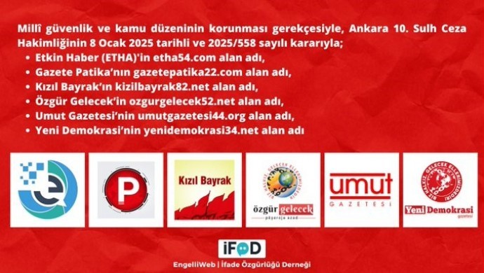 Sosyalist çizgide yayın yapan Gazete Patika, ETHA, Mücadele Birliği, Kızıl Bayrak, Özgür Gelecek, Umut Gazetesi ve Yeni Demokrasi Gazetesi’nin haber sitelerine erişim engeli getirildi.