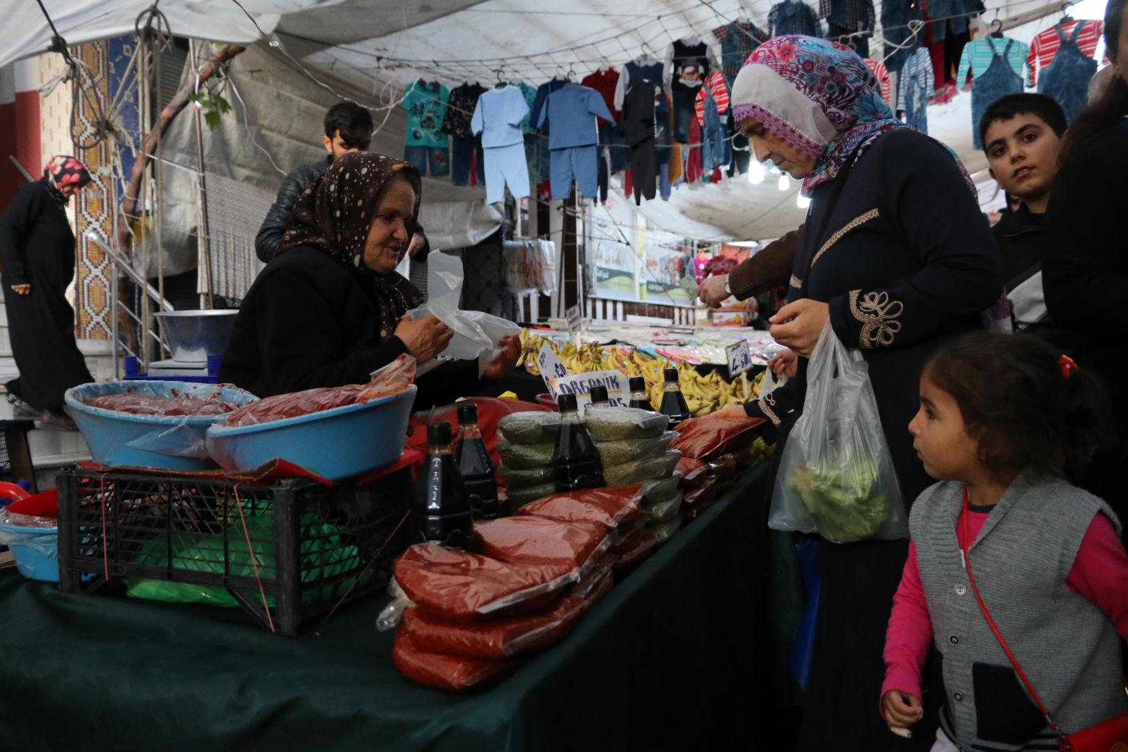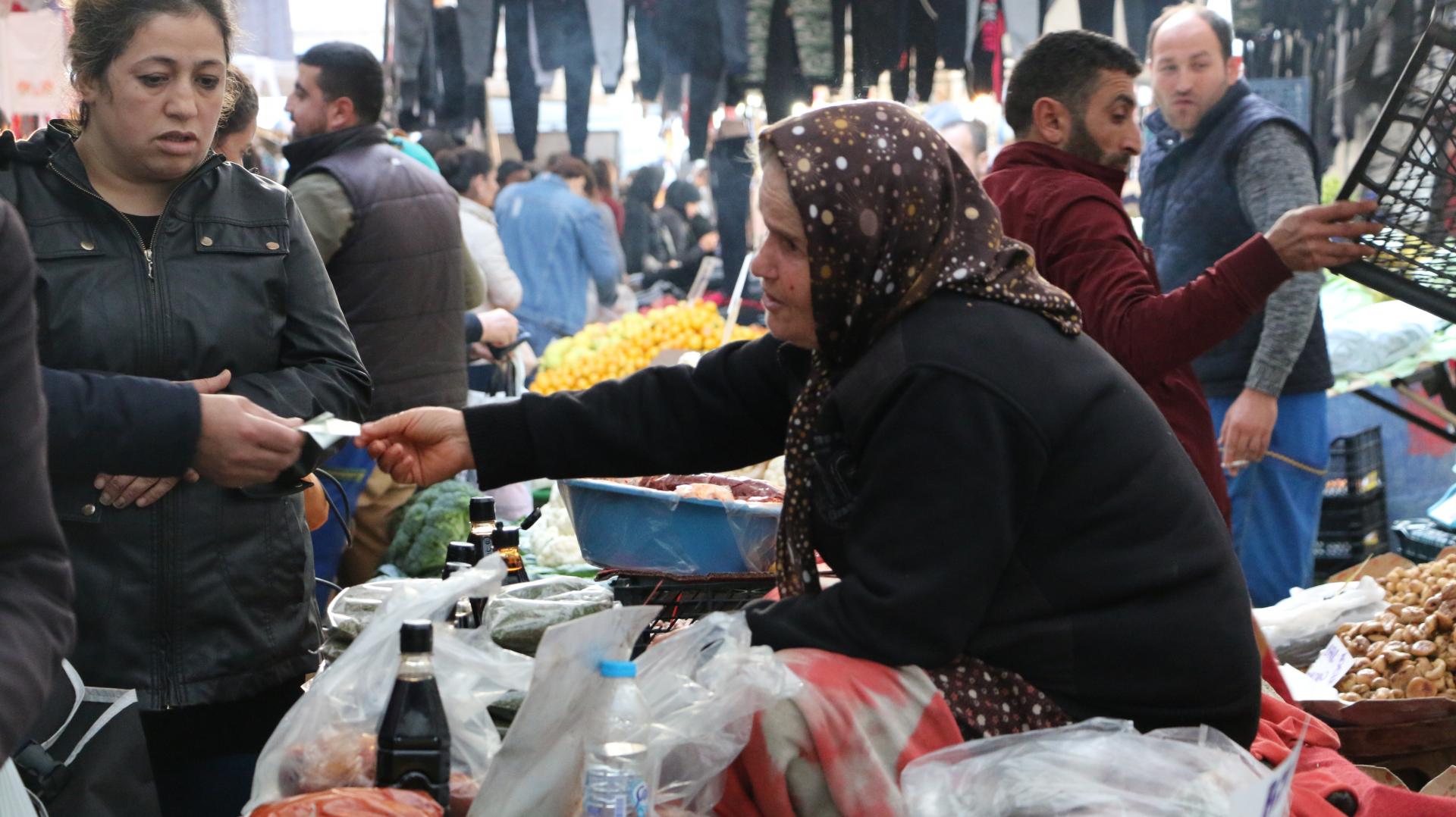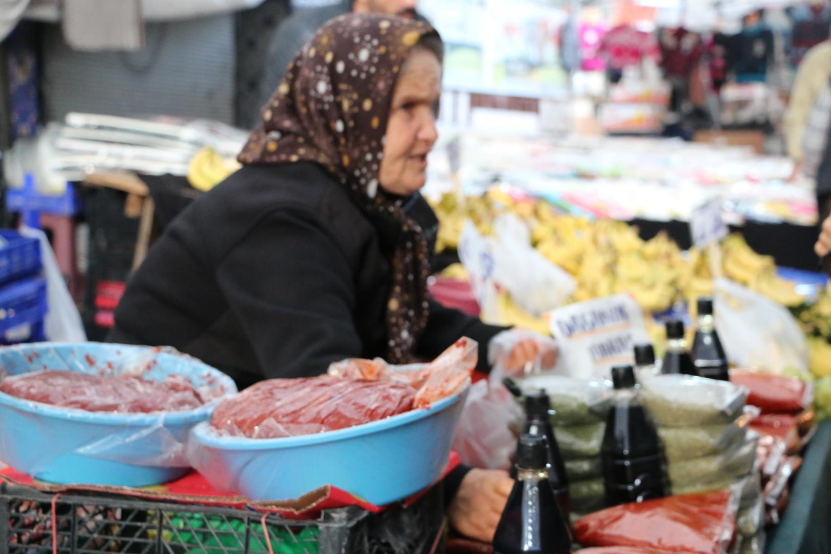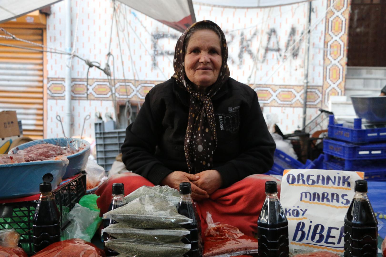 Emine Demir, İstanbul’da yaşıyor ama Maraş’a da gidip geliyor. Pazarda sattığı kekik, nane, nar ekşisi, kırmızı biberi ve salçayı memleketinden getirdiğini ve organik olduğunu söylüyor Demir. “Emeklilik yok, evde tek çalışıyorum. Evde yedi kişiye bakıyorum. Sekiz senedir eşim felçli yatıyor. Diğerleri de çalışmıyor” diyor.
