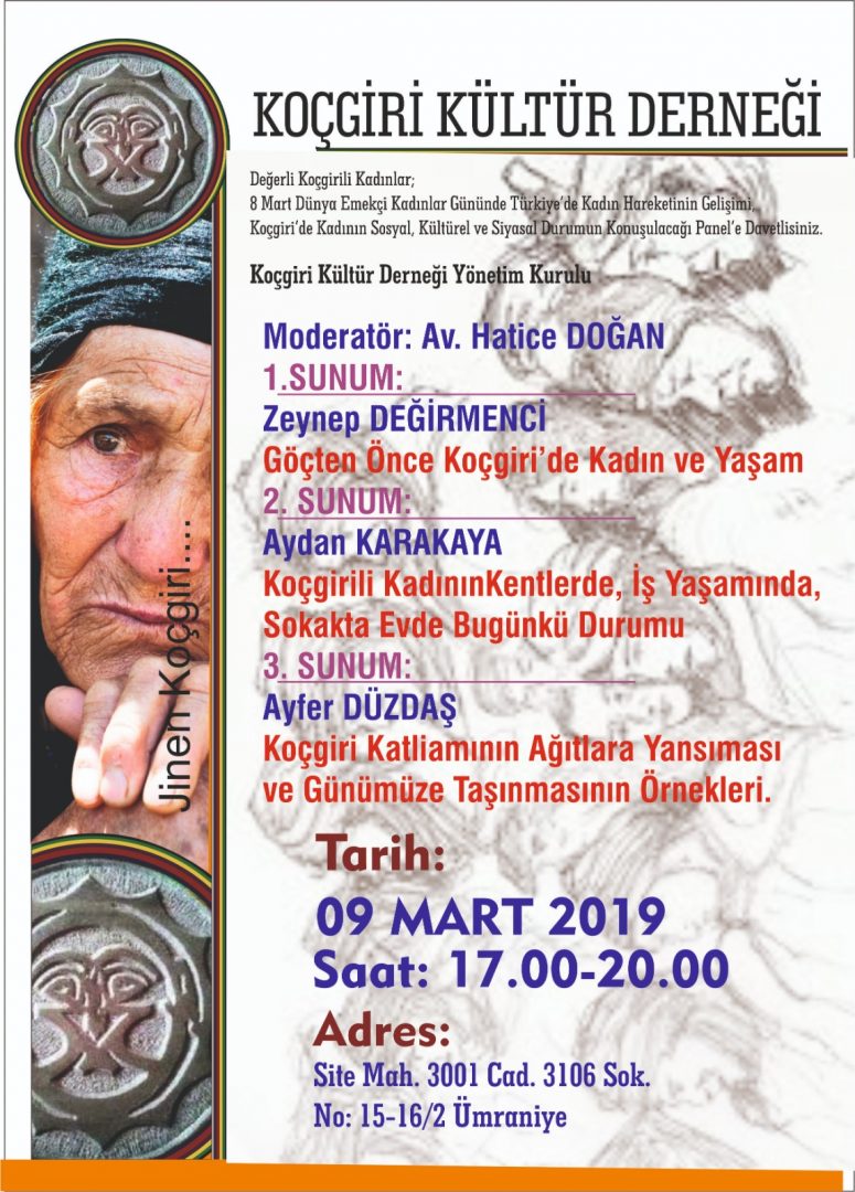 Koçgiri Kültür Derneği, 8 Mart etkinlikleri kapsamında, “Türkiye’de Kadın hareketinin gelişimi, Koçgiri’de kadının sosyal, kültürel ve siyasal durumu” başlığı ile panel düzenleyecek.