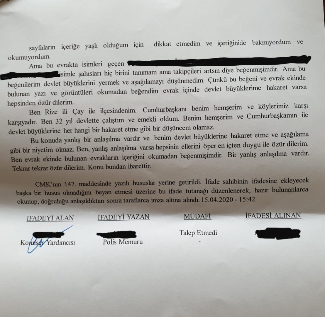 Yurttaş ifadesinde, beğenilerinde devlet büyüklerini aşağılamayı düşünmediğini belirterek “Bu beğenilerim devlet büyüklerini ve aşağılamayı düşünmedim. Çünkü bu beğeni ve evrak ekinde bulunan yazı ve görüntüleri okumadan beğendim. Evrak içinde devlet büyüklerime hakaret varsa hepsinden özür dilerim” dedi.