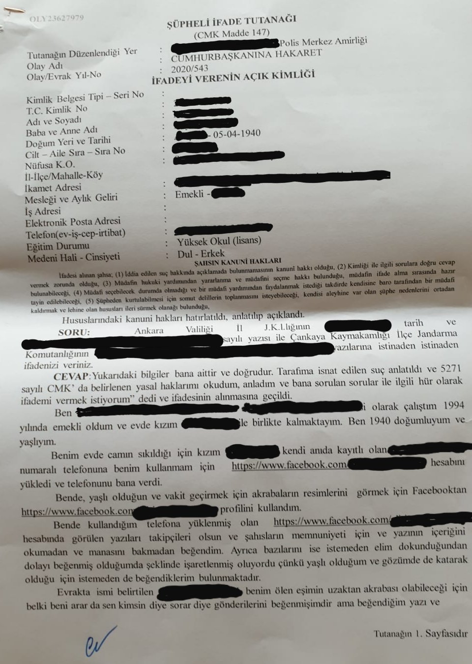 PİRHA – Ankara’da koronavirüs salgını nedeniyle evden çıkması yasak olan 80 yaşındaki bir kişi, sosyal medyada başkalarının yaptığı paylaşımı beğendiği için polis tarafından Cumhurbaşkanı’na hakaret suçlamasıyla ifadesi alınmak üzere karakola götürüldü.