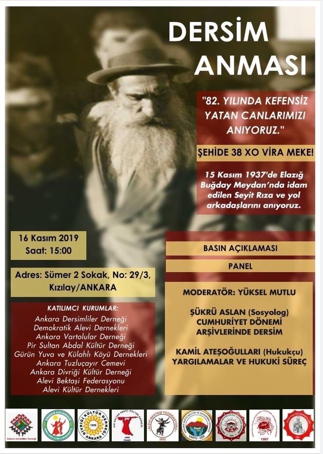 16 Kasım saat 15:00’te Sümer 2 Sokak No:29/3 Kızılay adresinde yapılacak anmada ilk olarak basın açıklaması okunacak. Programın devamında ise Yüksel Mutlu’nun moderatörlüğünde Sosyolog Şükrü Aslan ‘Cumhuriyet dönemi arşivlerinde Dersim’ konusunu, Hukukçu Kamil Ateşoğulları ise ‘Yargılamalar ve hukuki süreç’ başlıklarına dair sunumlar yapacak.