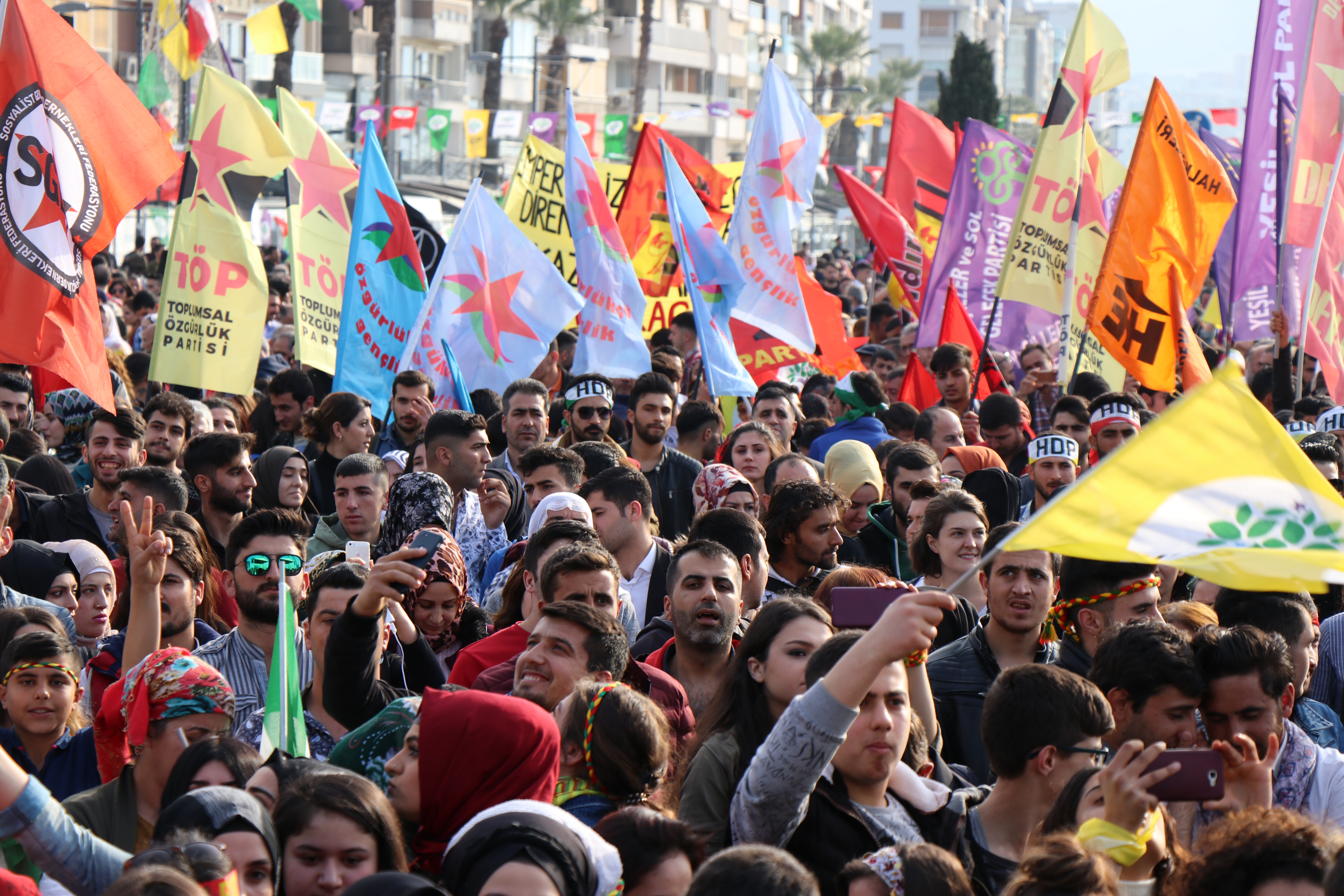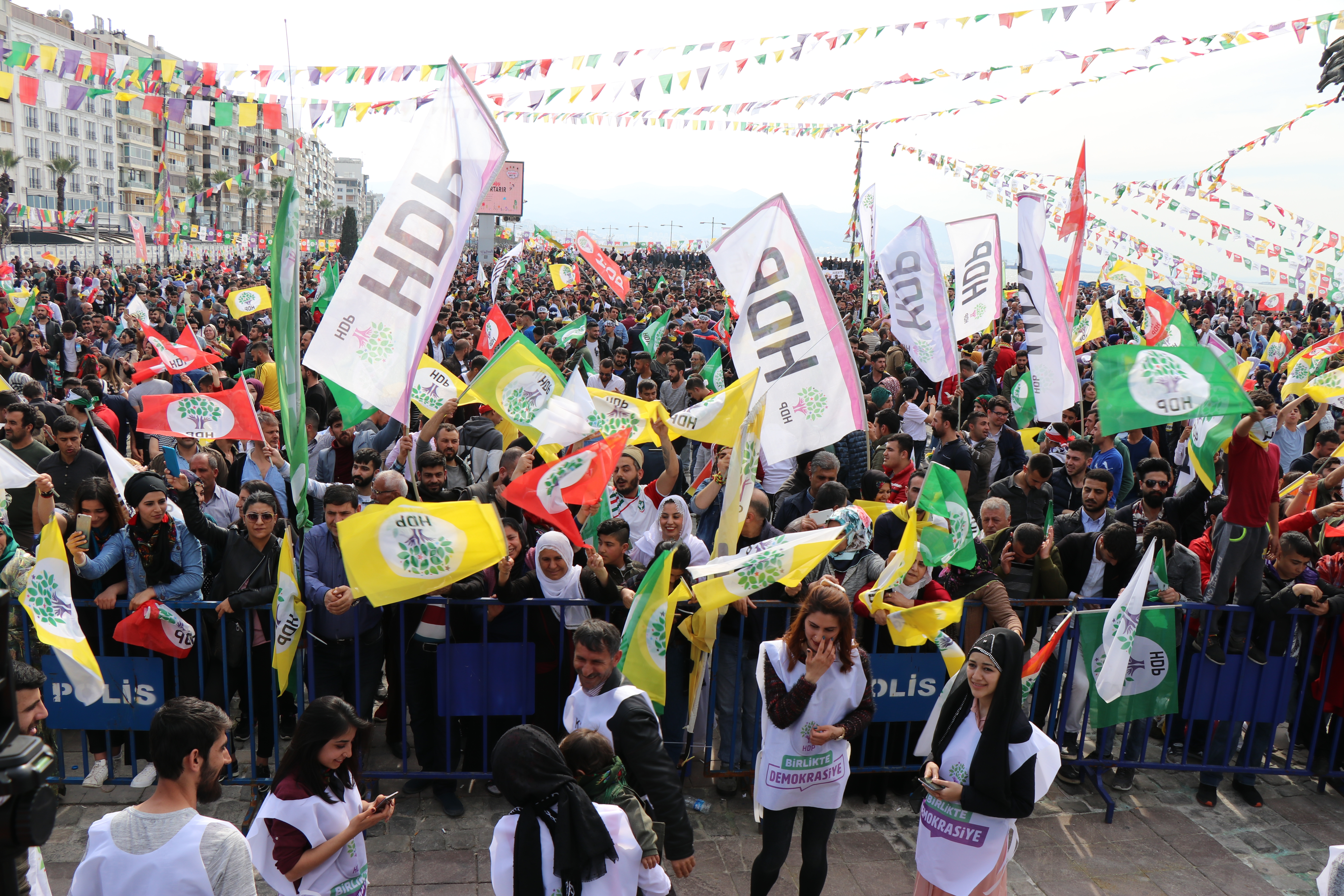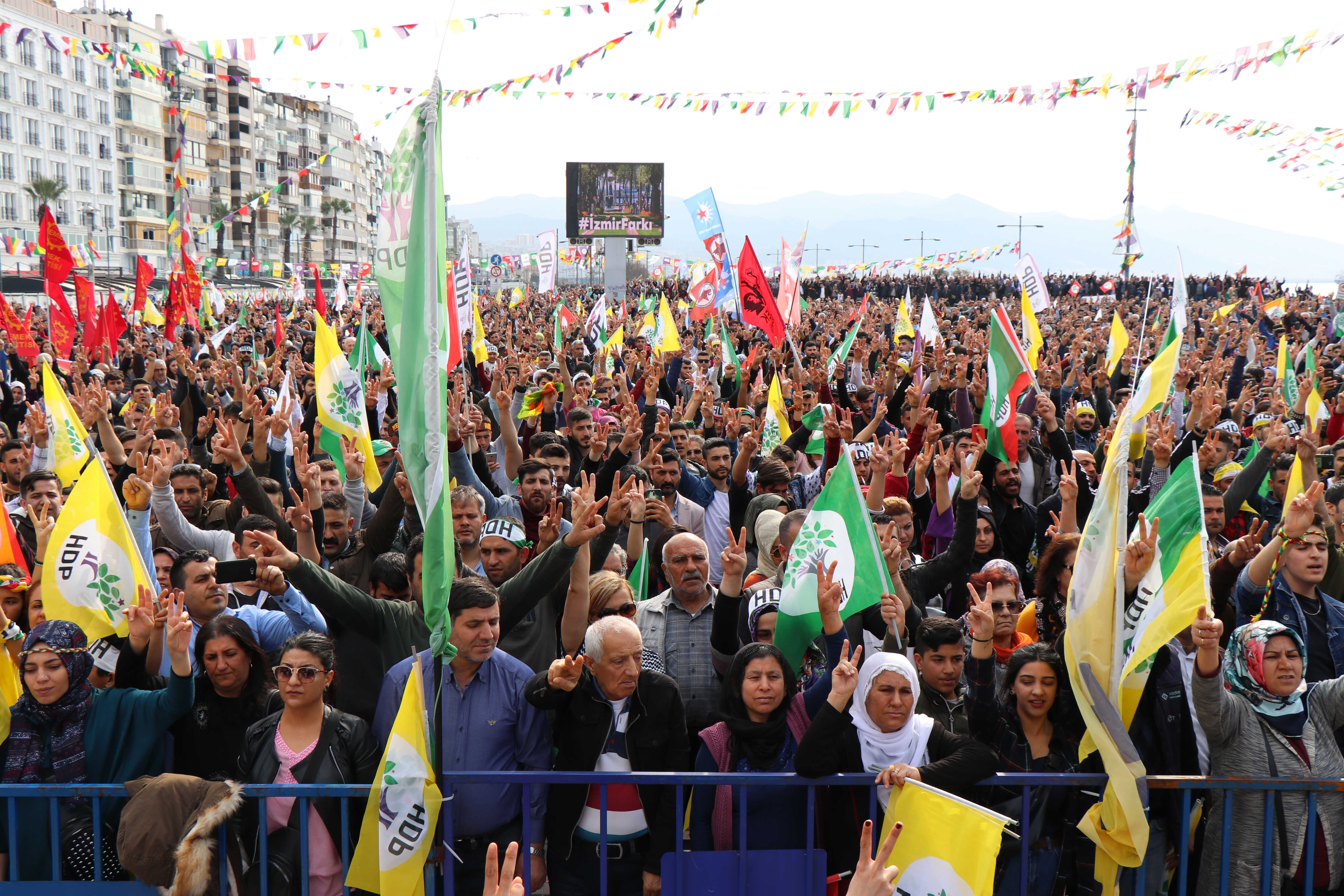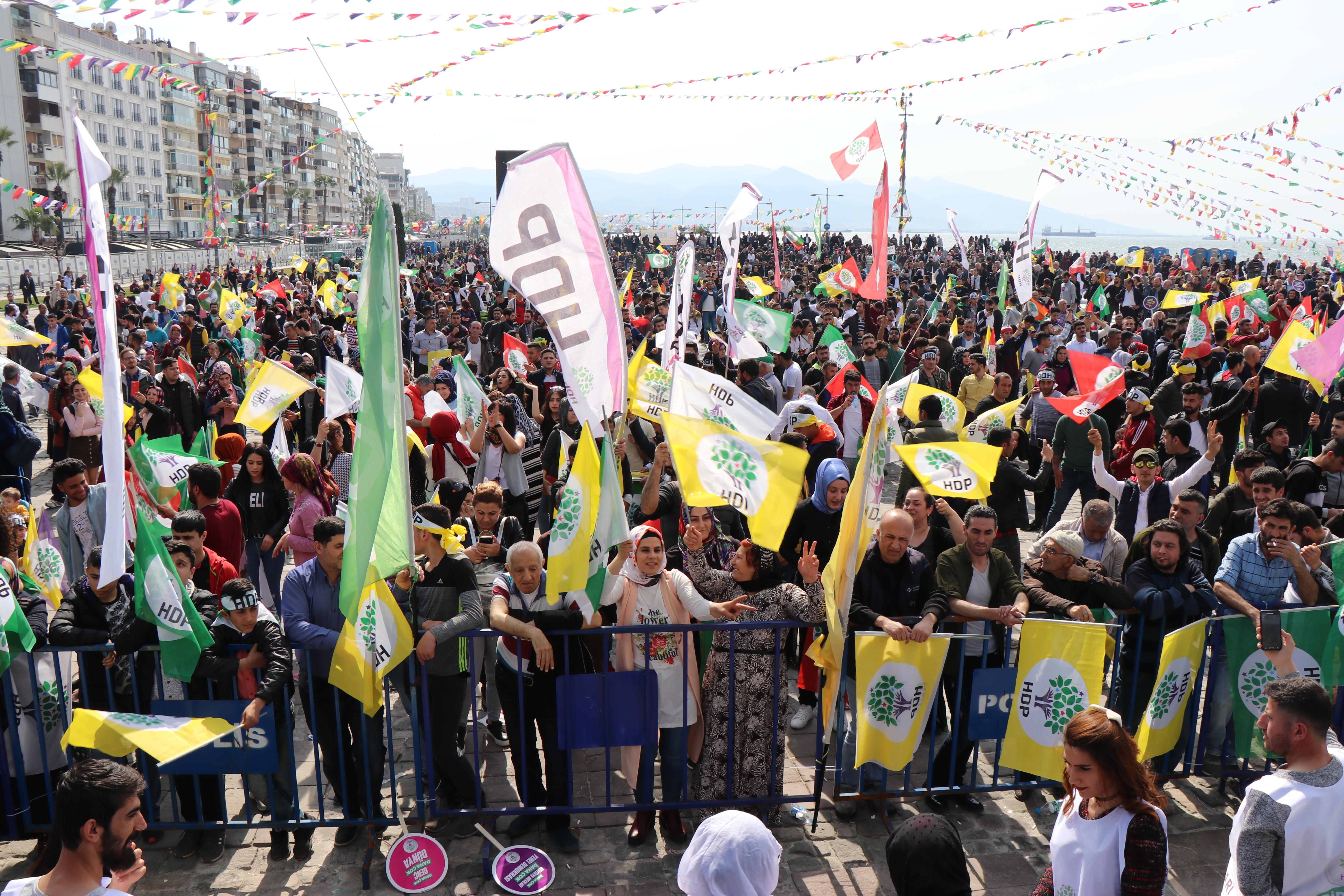 PİRHA-Halkların Demokratik Partisi (HDP) İzmir İl Örgütü’nün “Mutlaka kazanacağız, tecridi kıracağız” şiarıyla Gündoğdu Meydanı’nda düzenlediği mitinge on binler katıldı. Kutlamada konuşan HDP milletvekili Serpil Kemalbay, Türkiye halklarının birlikte yaşamak istediğine değinirken, Feleknas Uca ise 31 Mart seçimlerinde ilk olarak tecridi kıracaklarını vurguladı. Devletin çözüm masasını devirerek barışı baltaladığını söyleyen HDK eş sözcüsü ve Muş Milletvekili Gülistan Kılıç Koçyiğit, hükümetin açlık grevleri için derhal adım atması çağrısında bulundu.