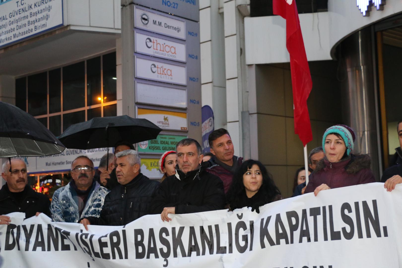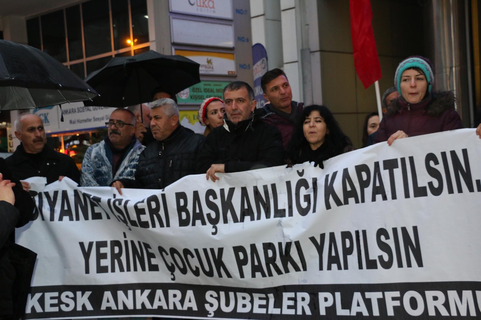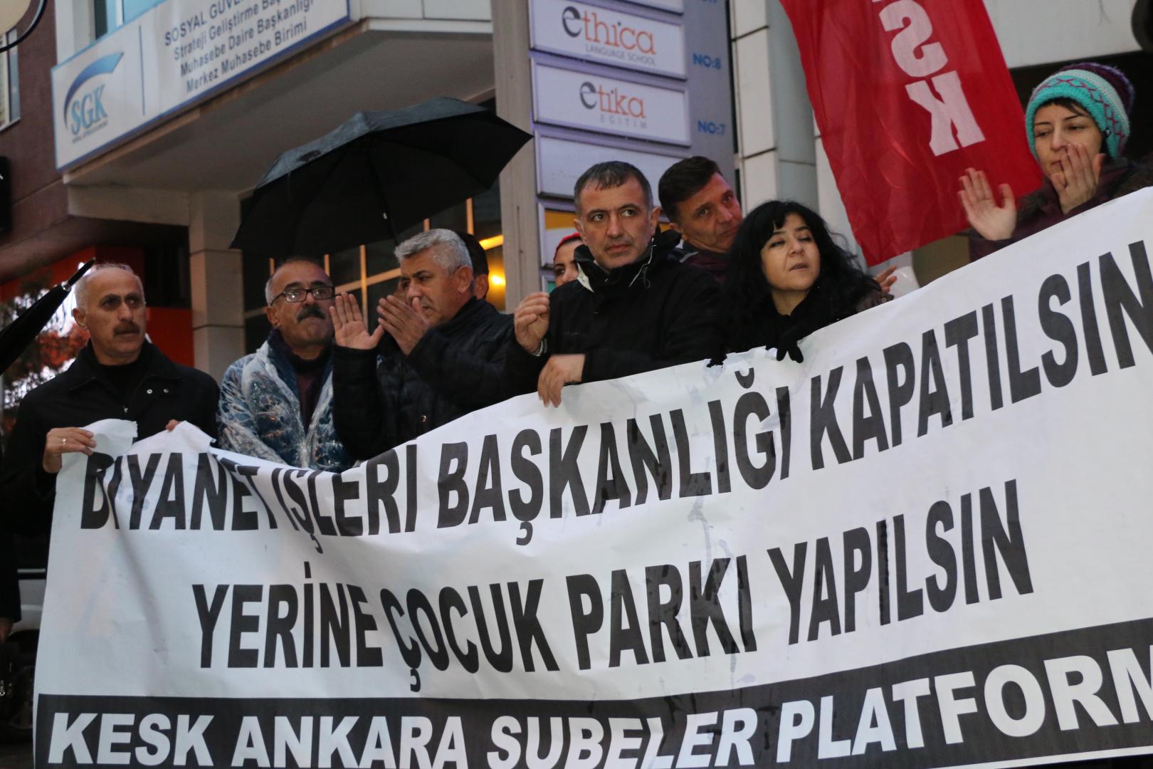 PİRHA – KESK Şubeler Platformu tarafından Kızılay Sakarya Caddesi’nde valiliğin yasağı gerekçe gösterilerek izin verilmeyen basın açıklaması Eğitim Sen 5 No’lu Üniversiteler Şubesi’nin önünde gerekleştirildi. Basın açıklamasında Diyanet İşleri Başkanlığı’nın kapatılması, yerine çocuk parkının yapılması gerektiği belirtildi.