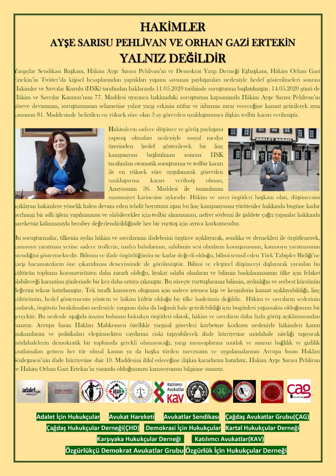 Adalet İçin Hukukçular, Avukat Hareketi, Avukatlar Sendikası, Çağdaş Avukatlar Grubu (ÇAG), Çağdaş Hukukçular Derneği (ÇHD), Demokrasi İçin Hukukçular, Karşıyaka Hukukçular Derneği, Kartal Hukukçular Derneği, Katılımcı Avukatlar (KAV), Özgürlükçü Demokrat Avukatlar Grubu (ÖDAV), Özgürlük İçin Hukukçular Derneği, Yargıçlar Sendikası Başkanı ve Hakim Ayşe Sarısu Pehlivan’ın ve Demokrat Yargı Derneği Eşbaşkanı ve Hakim Orhan Gazi Ertekin’in Twitter’da kişisel hesaplarından yaptıkları yaşamı savunan paylaşımları nedeniyle hedef gösterilmeleri sonrası Hakimler ve Savcılar Kurulu (HSK) tarafından haklarında başlatılan soruşturmaya ilişkin ortak açıklama yaptı.