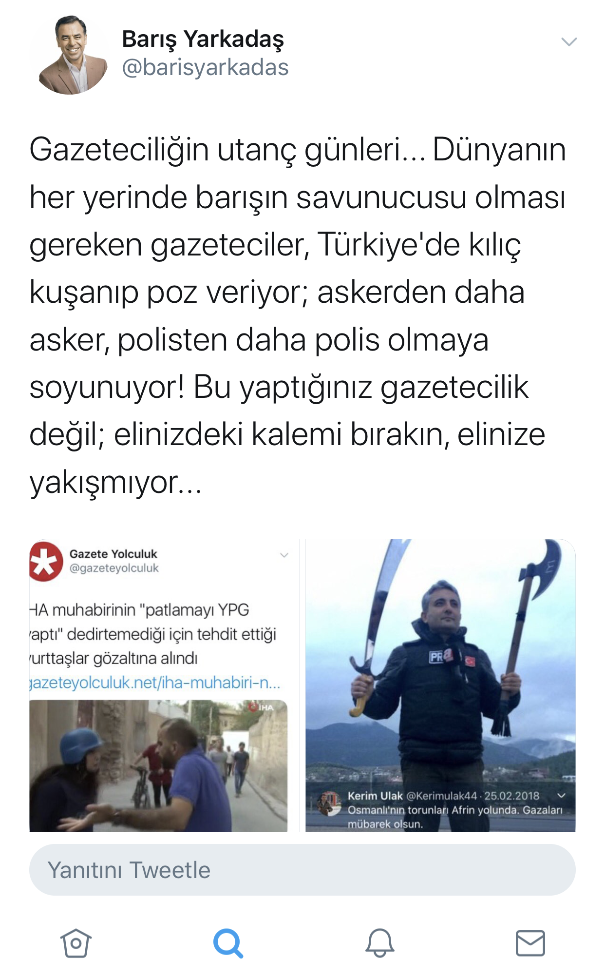 CHP 26. Dönem Milletvekili Barış Yarkadaş sosyal medya hesabında ‘Gazeteciliğin utanç günleri‘ başlığıyla paylaştığı fotoğrafta A Haber Müdürü Kerim Ulak ve ve İHA muhabiri için yayımladığı mesajında, “Gazeteciliğin utanç günleri… Dünyanın her yerinde barışın savunucusu olması gereken gazeteciler, Türkiye’de kılıç kuşanıp poz veriyor; askerden daha asker, polisten daha polis olmaya soyunuyor! Bu yaptığınız gazetecilik değil; elinizdeki kalemi bırakın, elinize yakışmıyor” ifadelerini kullandı.