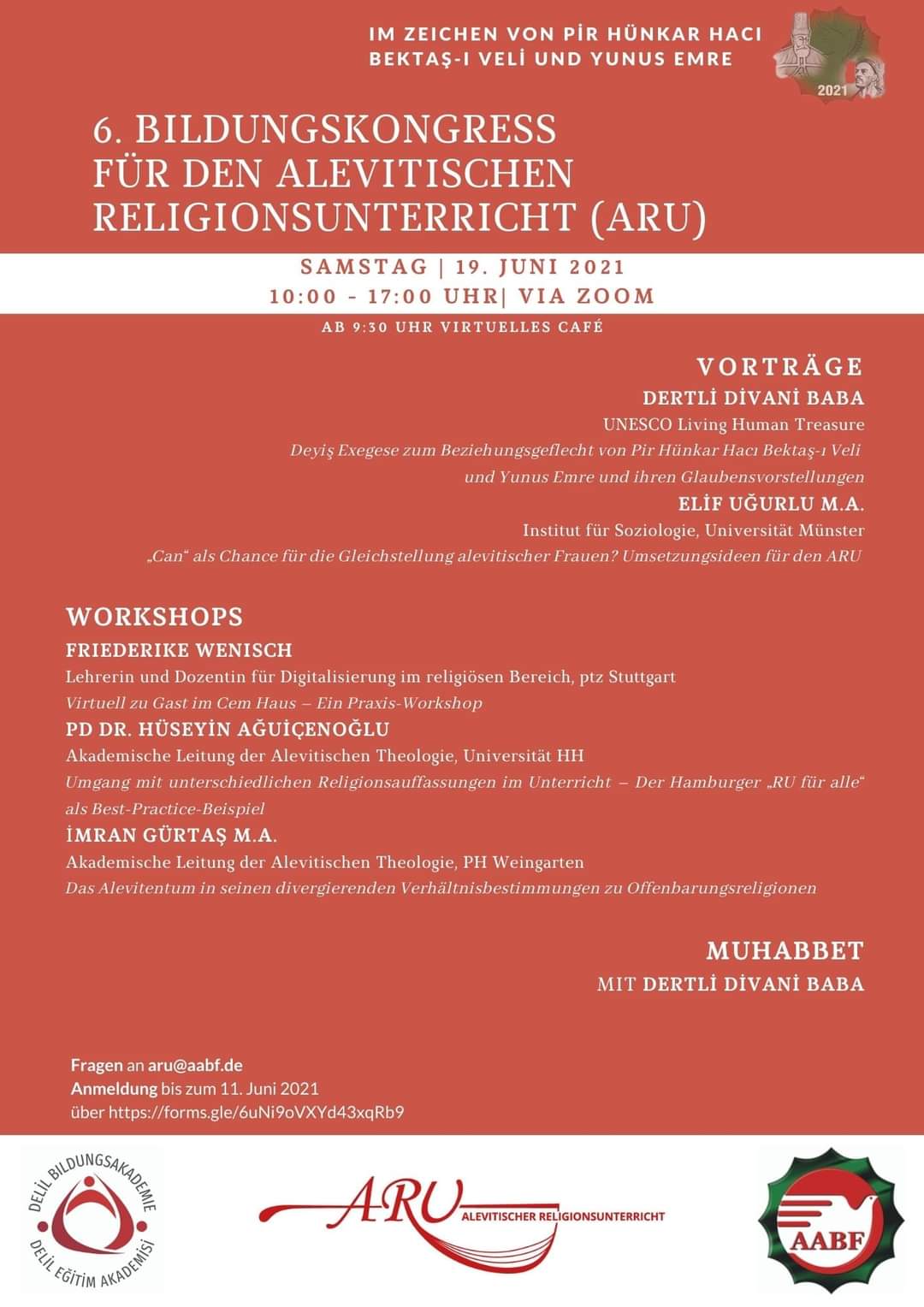 Almanya Alevi Birlikleri Federasyonu ( AABF), 19 Haziran 2021 tarihinde online olarak 6. Alevilik Dersleri Eğitim Kongresi düzenleyeceğin açıkladı.