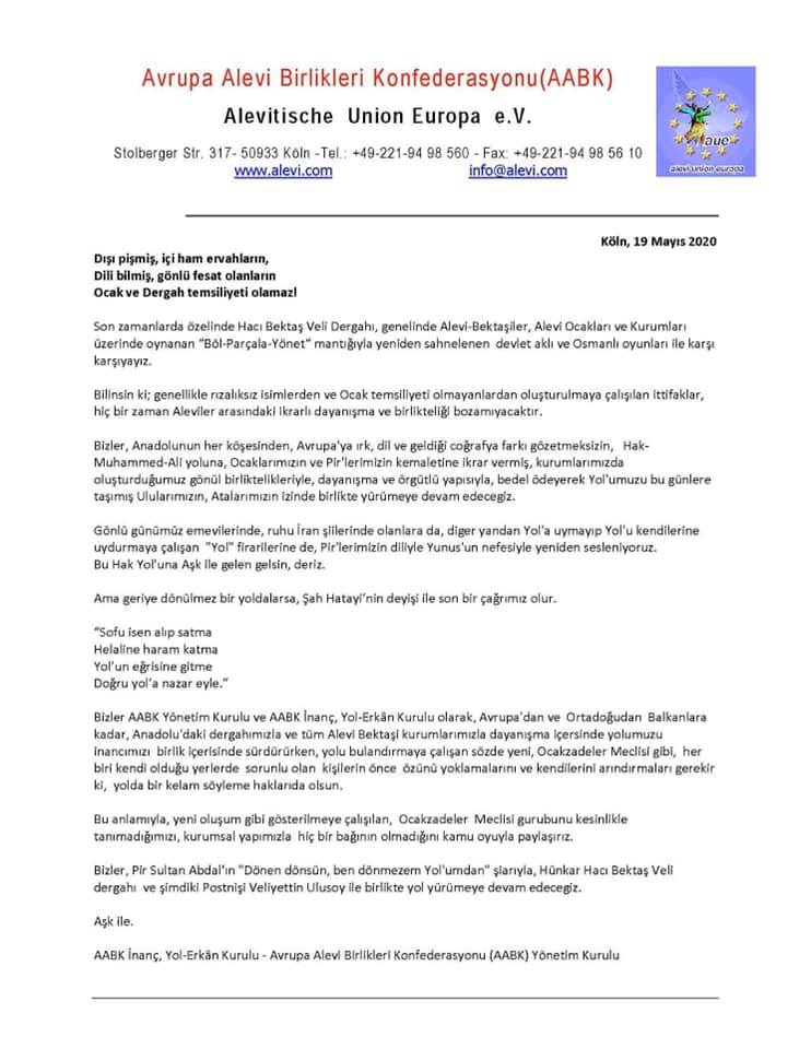 Bizler AABK Yönetim Kurulu ve AABK İnanç, Yol-Erkân Kurulu olarak, Avrupa’dan ve Ortadoğudan Balkanlara kadar, Anadolu’daki dergahımızla ve tüm Alevi Bektaşi kurumlarımızla dayanışma içersinde yolumuzu inancımızı birlik içerisinde sürdürürken, yolu bulandırmaya çalışan sözde yeni, Ocakzadeler Meclisi gibi, her biri kendi olduğu yerlerde sorunlu olan kişilerin önce özünü yoklamalarını ve kendilerini arındırmaları gerekir ki, yolda bir kelam söyleme hakları da olsun.