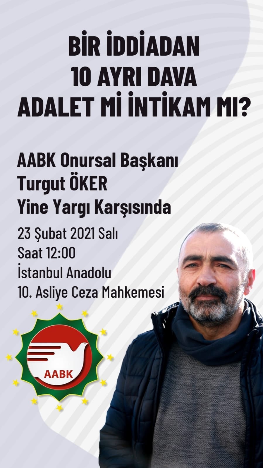 Avrupa Alevi Birlikleri Konfederasyonu ( AABK) Kurucu Genel Başkanı (AABK) Onursal Başkanı Turgut Öker’in duruşması 23 Şubat Salı günü, saat 12:00’de İstanbul Anadolu Adliyesi’nde görülecek.