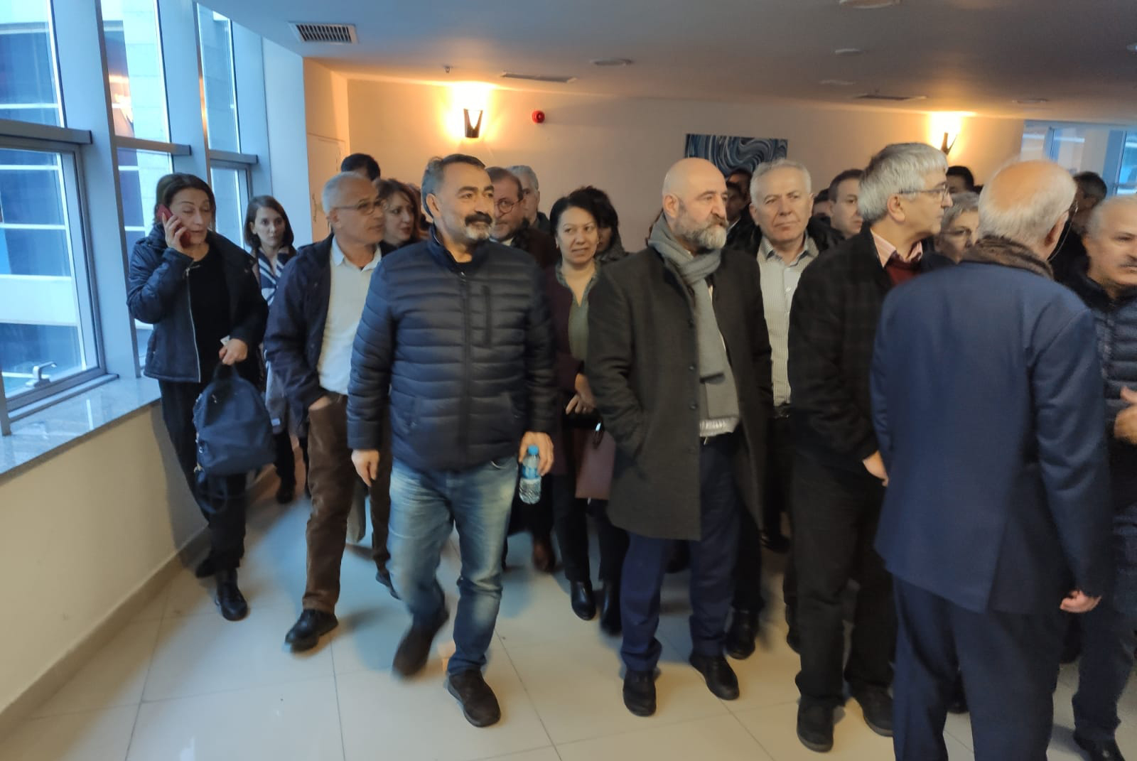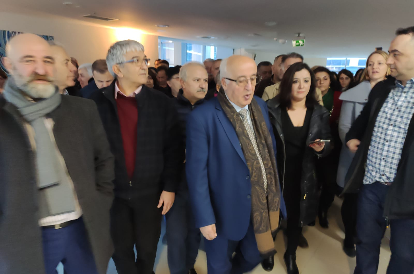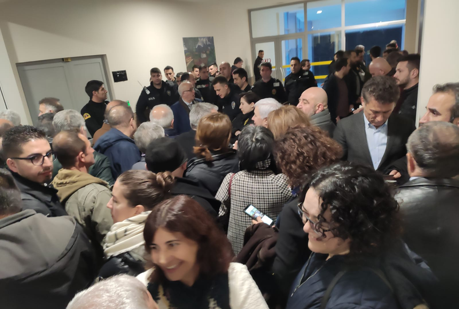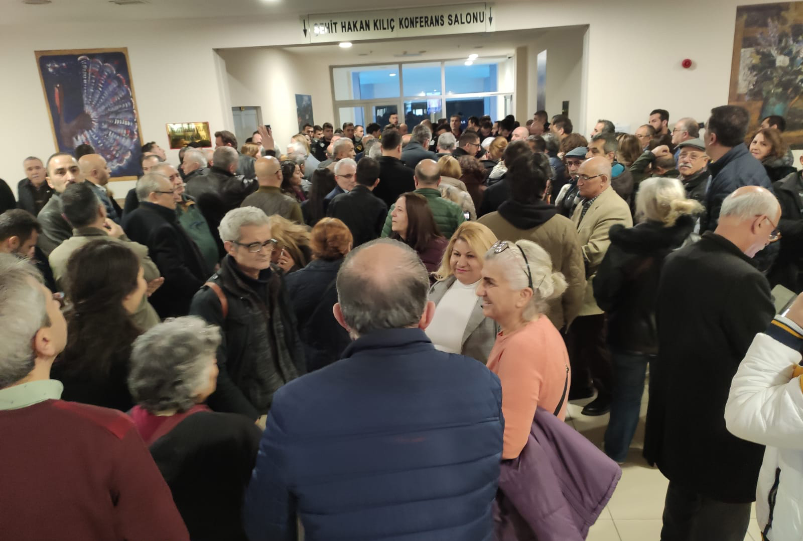 Konferans salonunda yer kalmadığı için içeri giremeyen vatandaşlar dışarıda bekliyor.