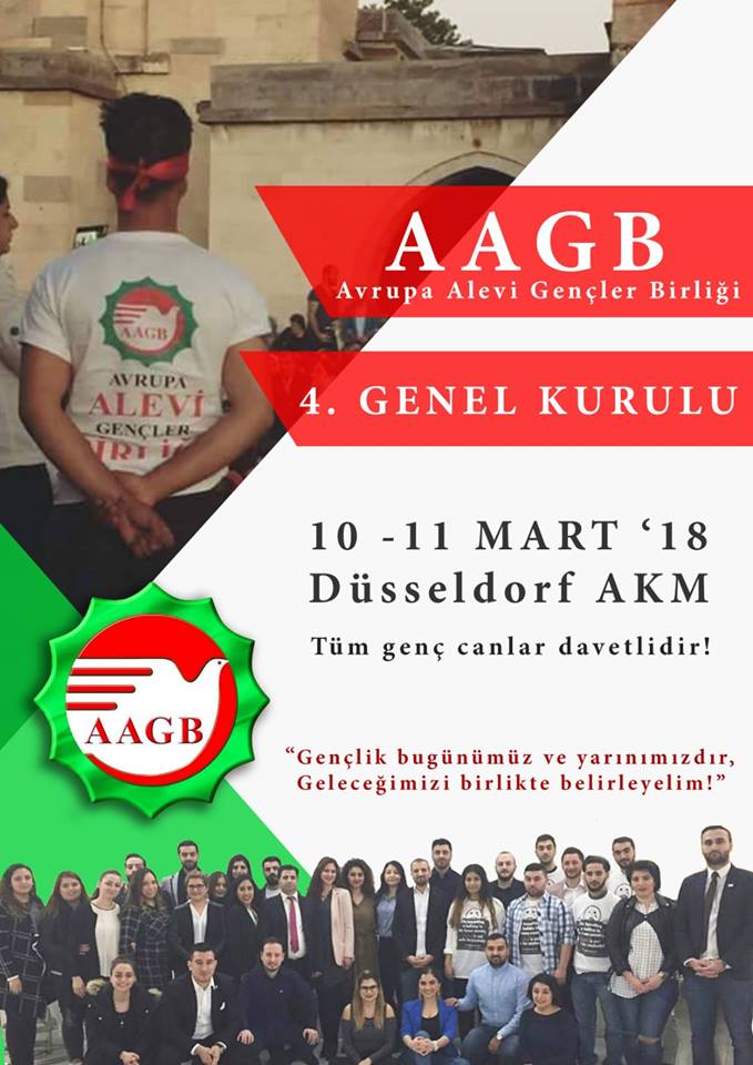 “Avrupa Alevi Gençler Birliği olarak 10 ve 11 Mart 2018 arası 4. olağan Genel Kurulumuzu bileşenimiz Almanya Alevi Gençler Birliğimizin ev sahipliğinde, Düsseldorf Alevi Kültür Merkezinde gerçekleştireceğiz.