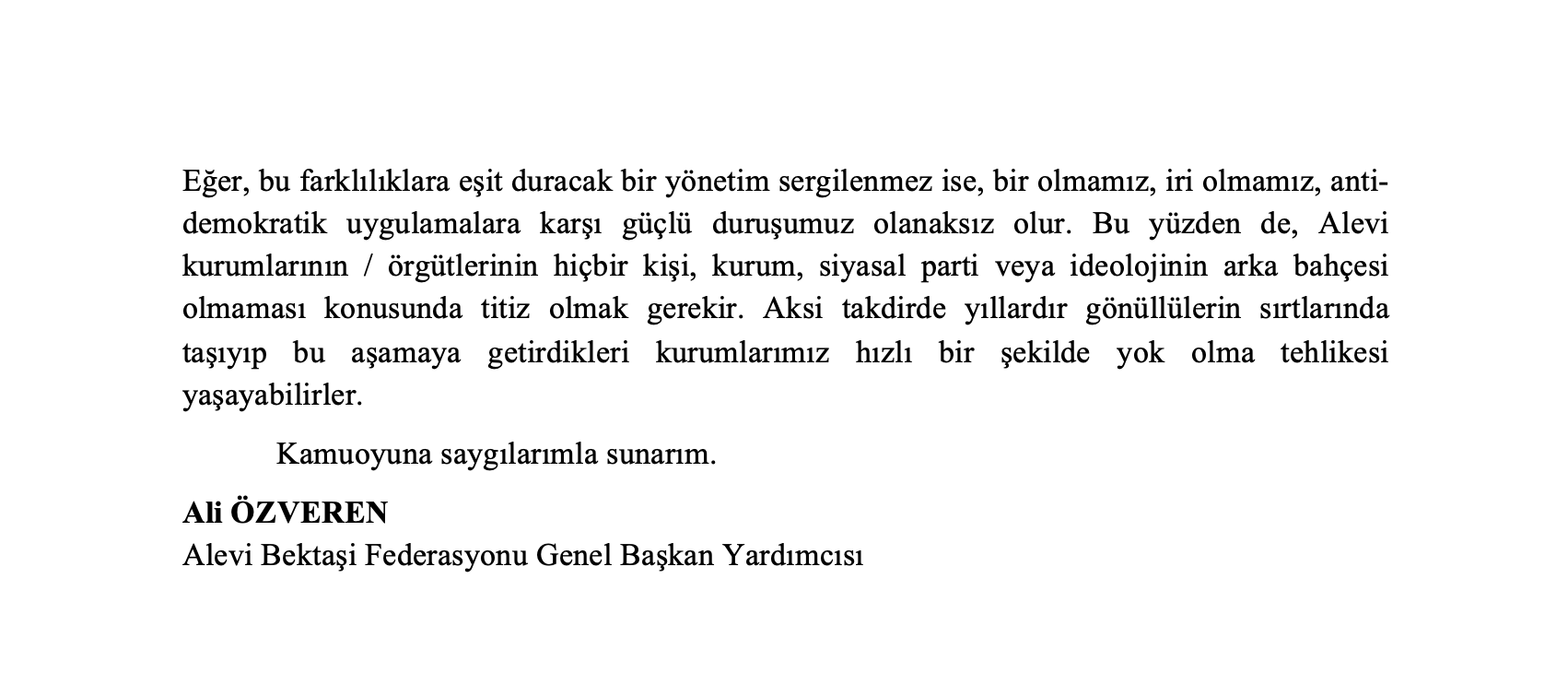 “Alevi kurumlarının iç işleyişi ile ilgili böyle bir açıklamayı yapmaktan dahi üzüntülü olduğumu belirtmek isterim. Ancak Türkiye’nin önemli bir süreçten geçtiği, iktisadi, toplumsal ve siyasal sorunların giderek katlandığı bir dönemde, kamuoyunun bir süredir Alevi kurumlarının iç işleyiş/disiplin sorunları ile meşgul edilmesi ve bu açıklamaların kurumlarımıza zarar vermesi dolayısıyla bu açıklamayı yapma zorunluluğu doğmuştur.